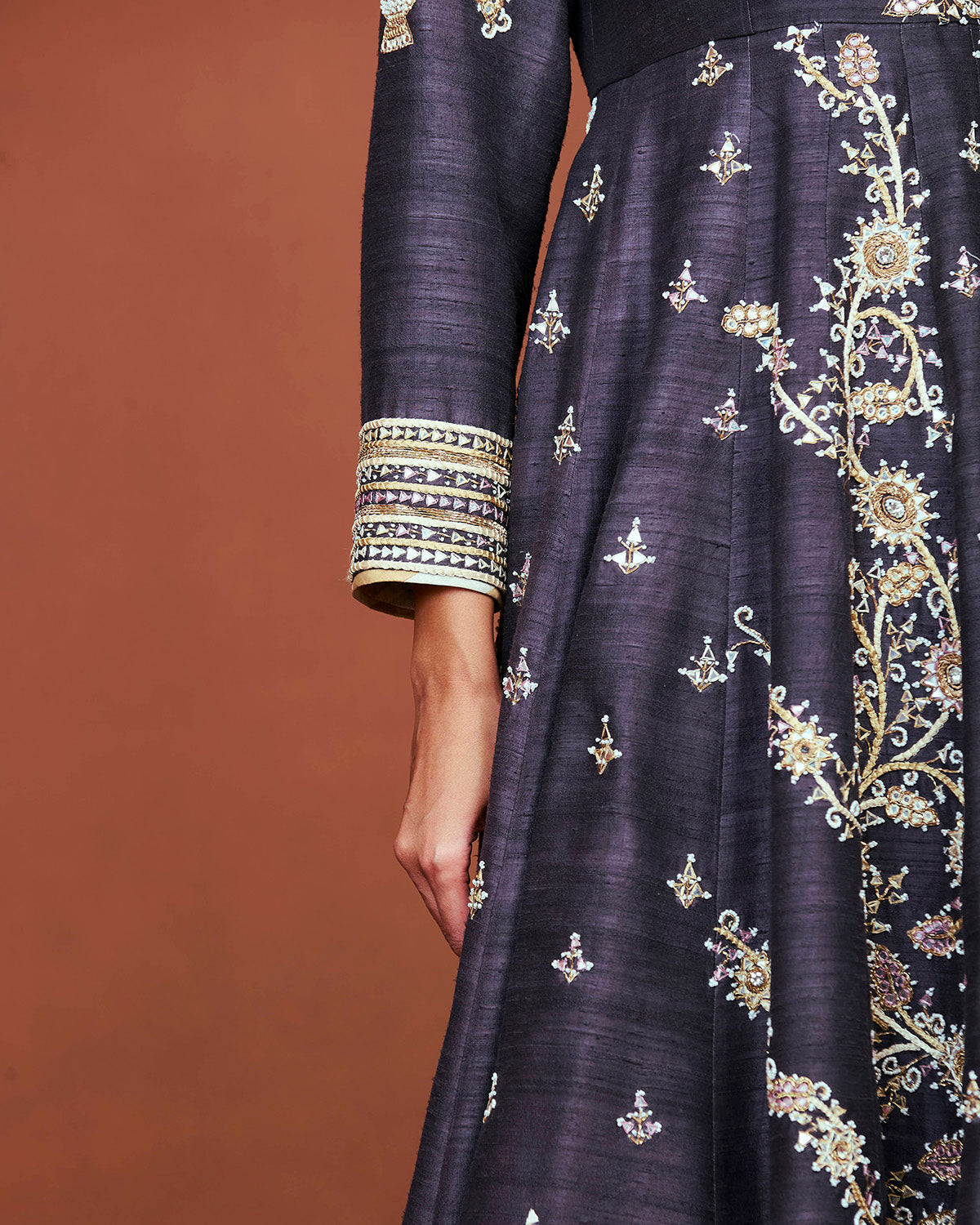 Embroidery Beautiful geometric floral motifs embroidered using silk threads, patri work, pitta work, pearls, and Swarovski.