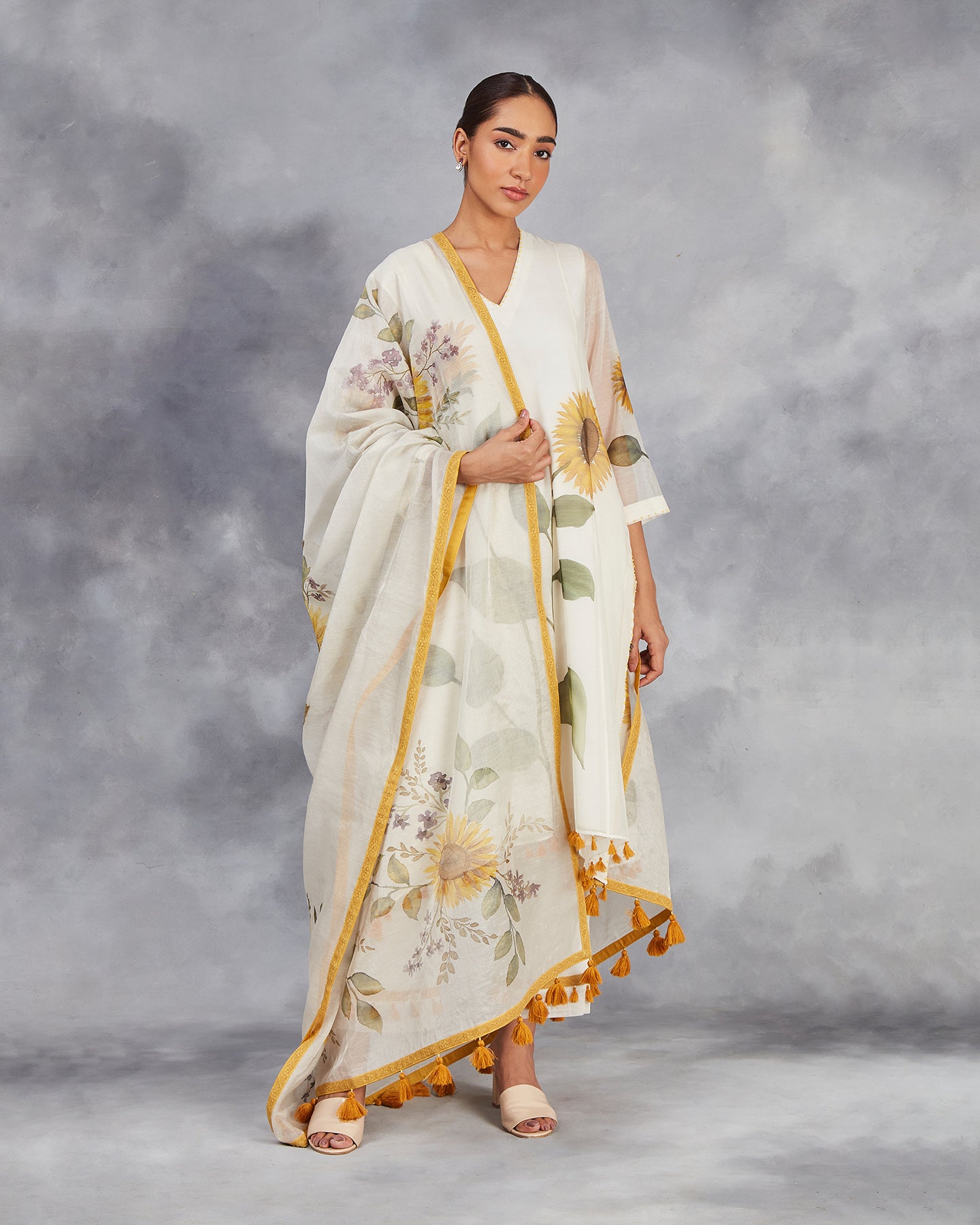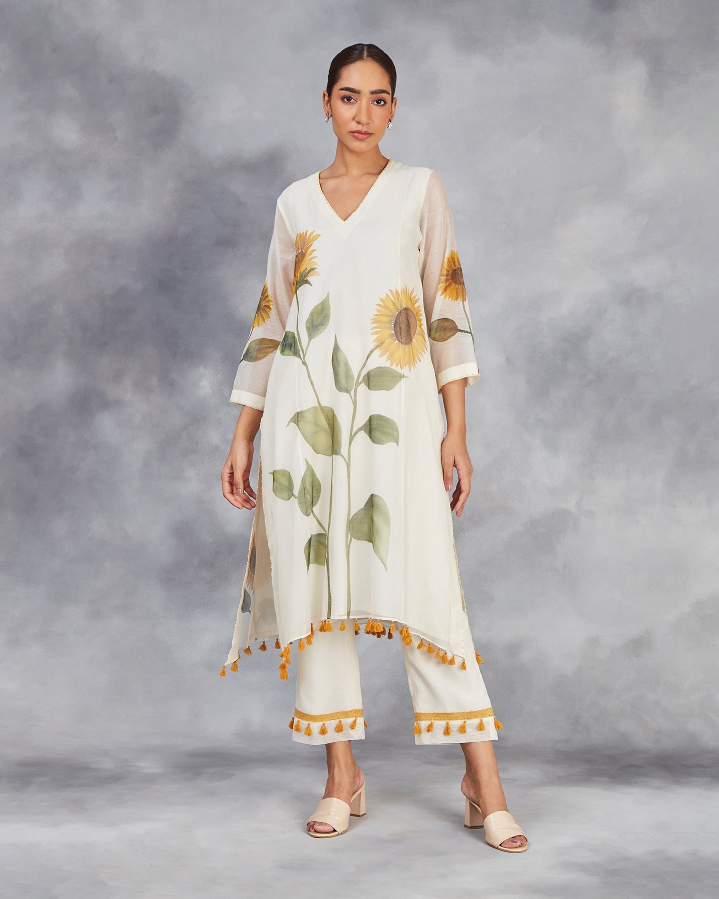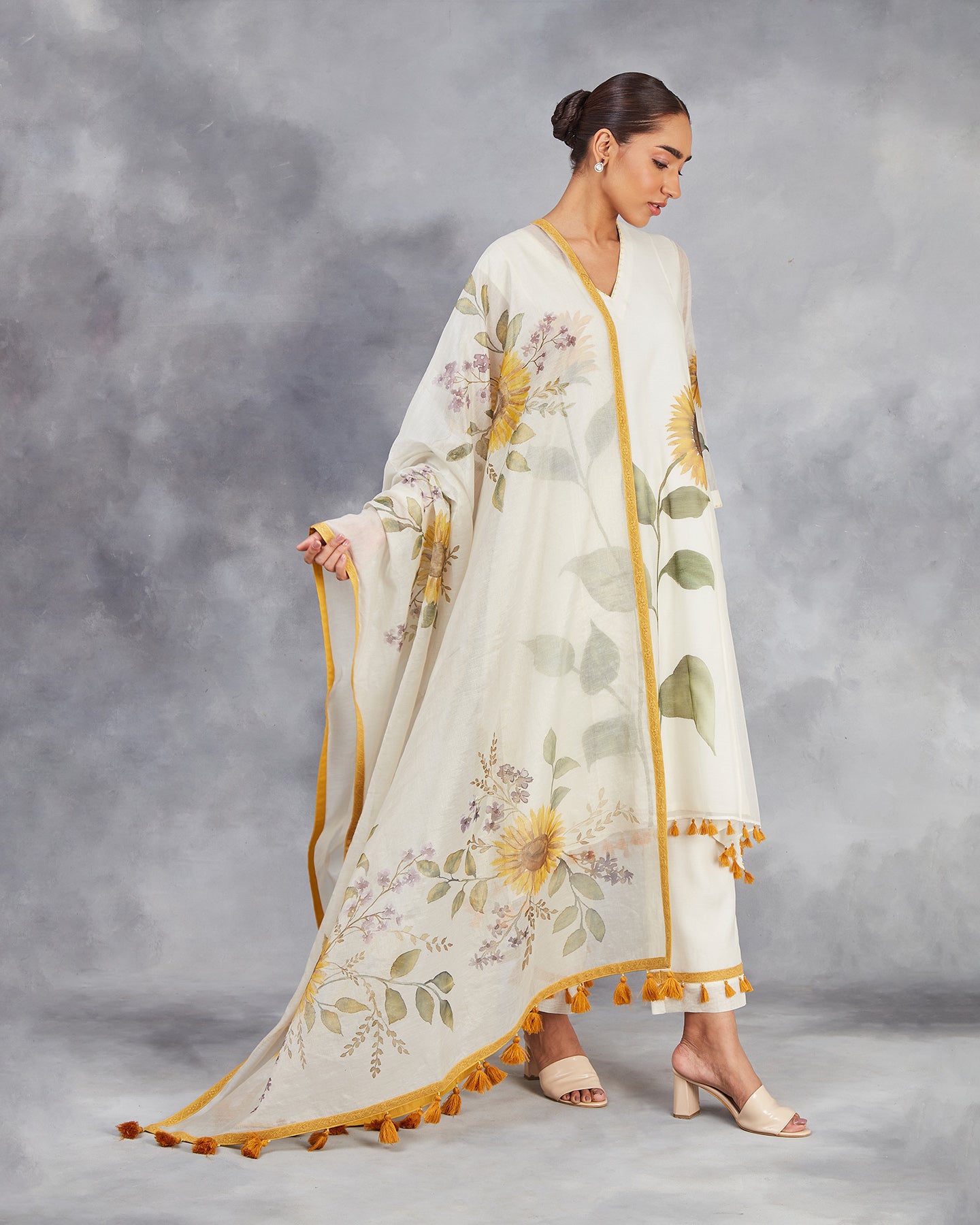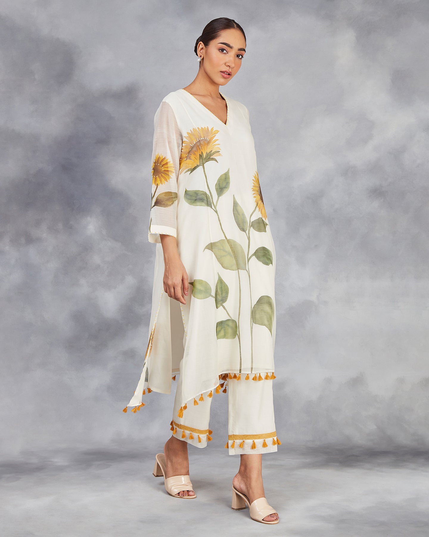 Experience timeless elegance with our off-white handwoven chanderi mulmul kurta set. The long kurta features a V-neckline and three-quarter sleeves. Matched with a pair of straight pants and a luxurious handwoven cotton tissue dupatta. All accentuated with delicate hand-painted sunflowers, cotton thread tassels and pearls.