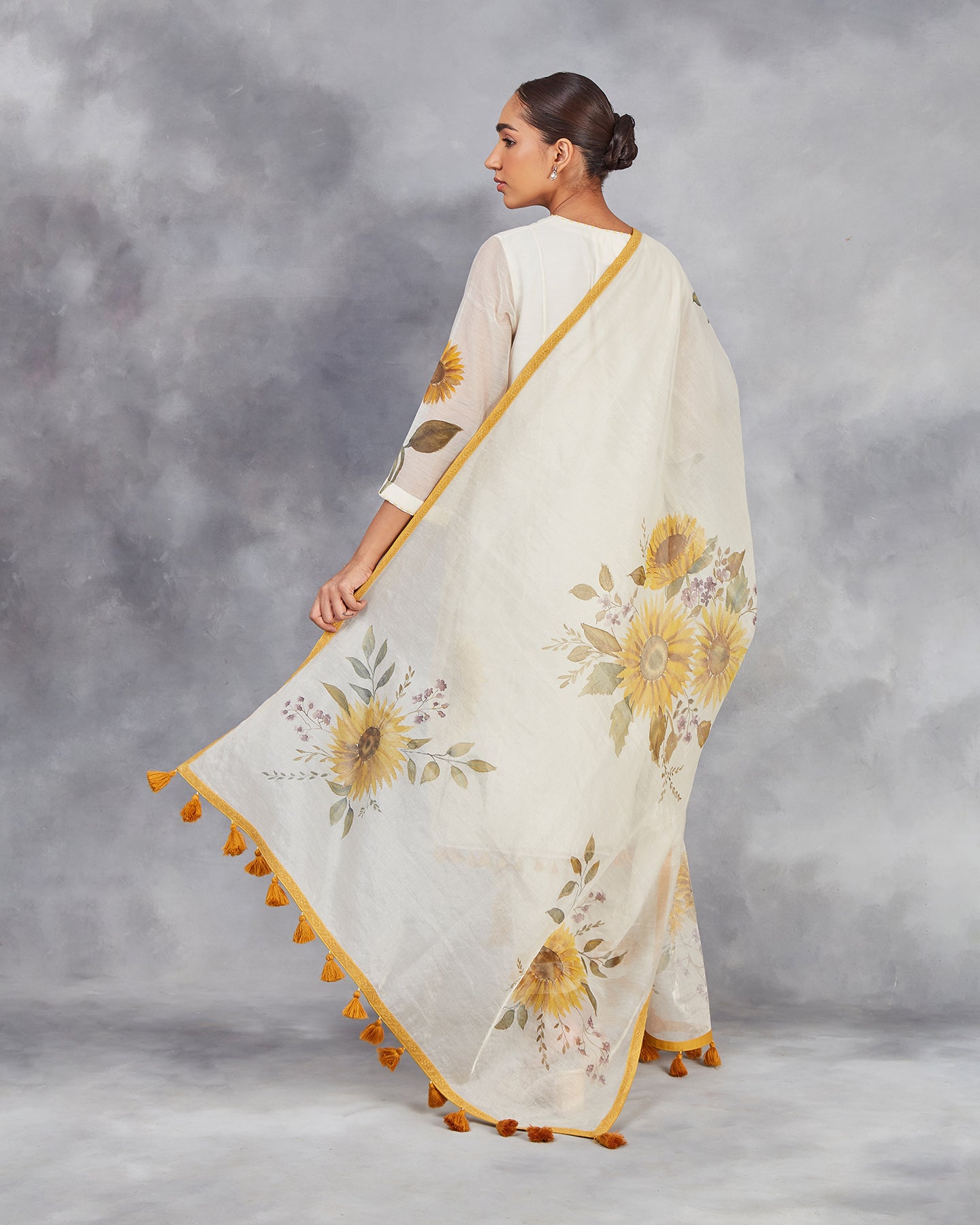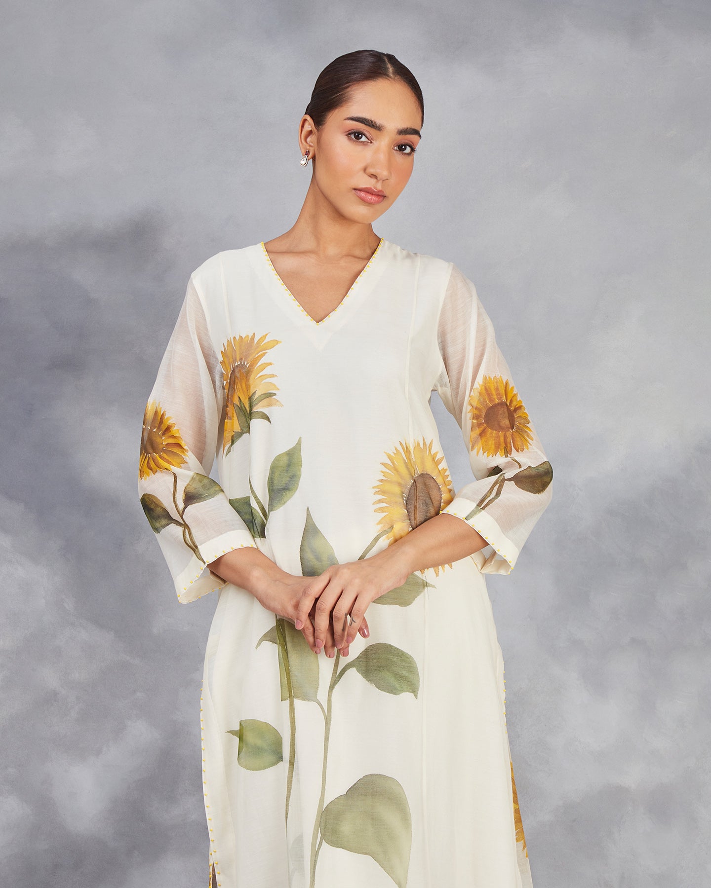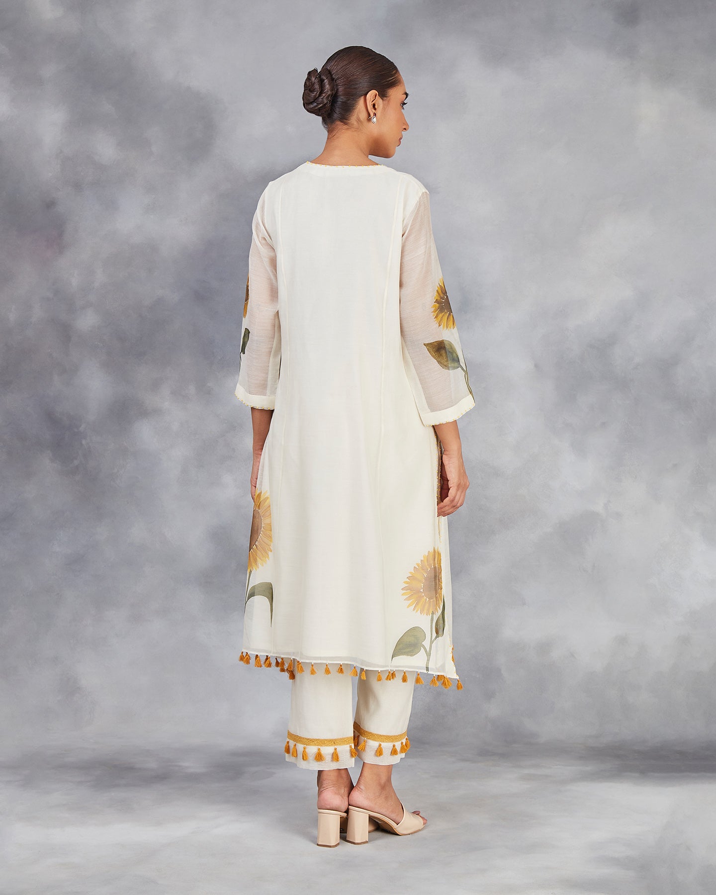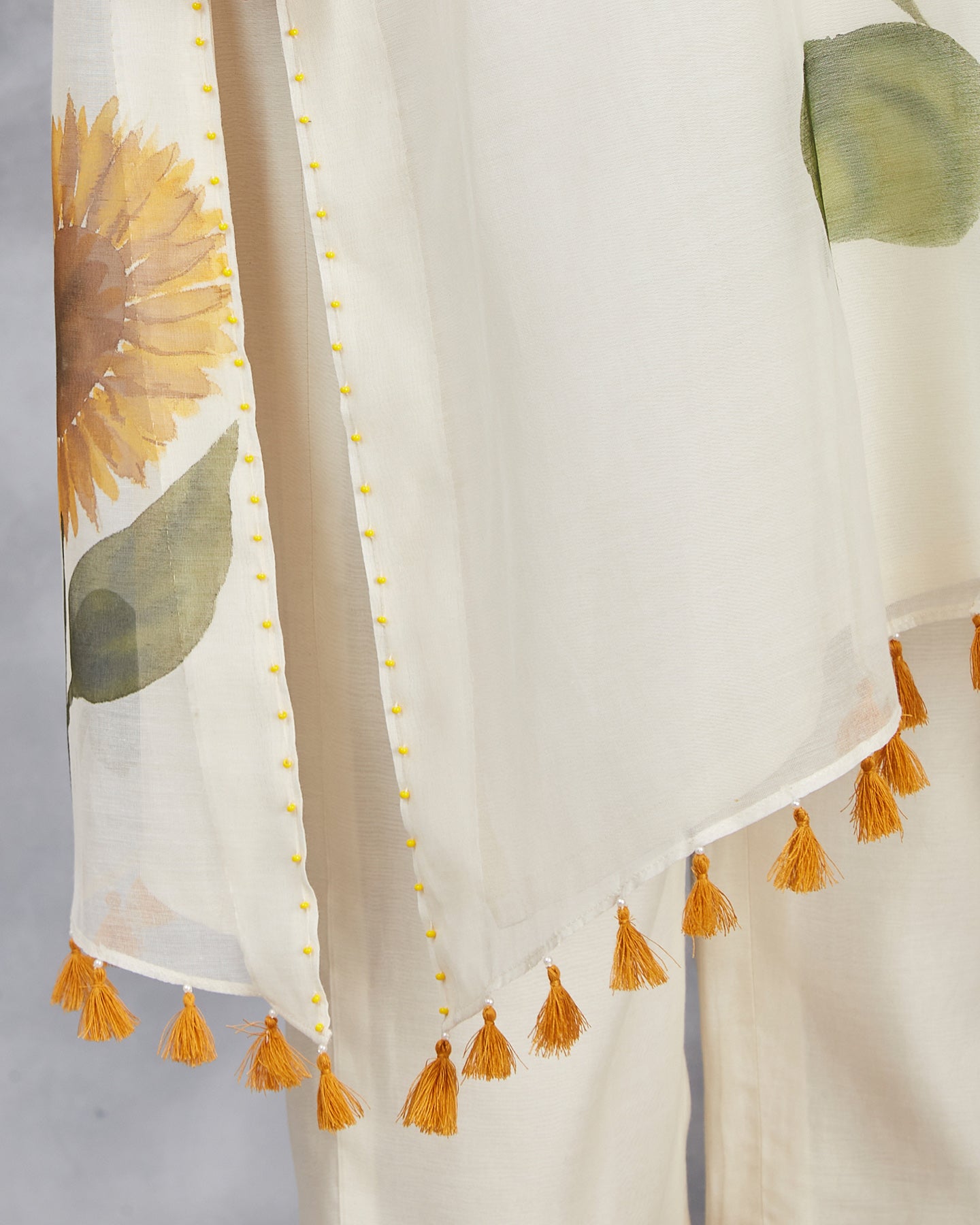 Experience timeless elegance with our off-white handwoven chanderi mulmul kurta set. The long kurta features a V-neckline and three-quarter sleeves. Matched with a pair of straight pants and a luxurious handwoven cotton tissue dupatta. All accentuated with delicate hand-painted sunflowers, cotton thread tassels and pearls.