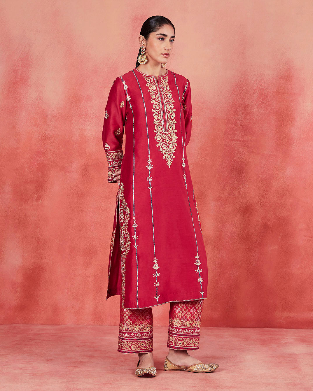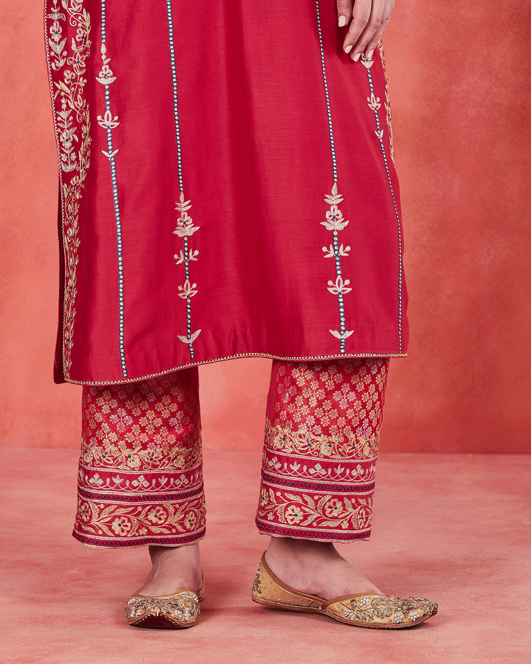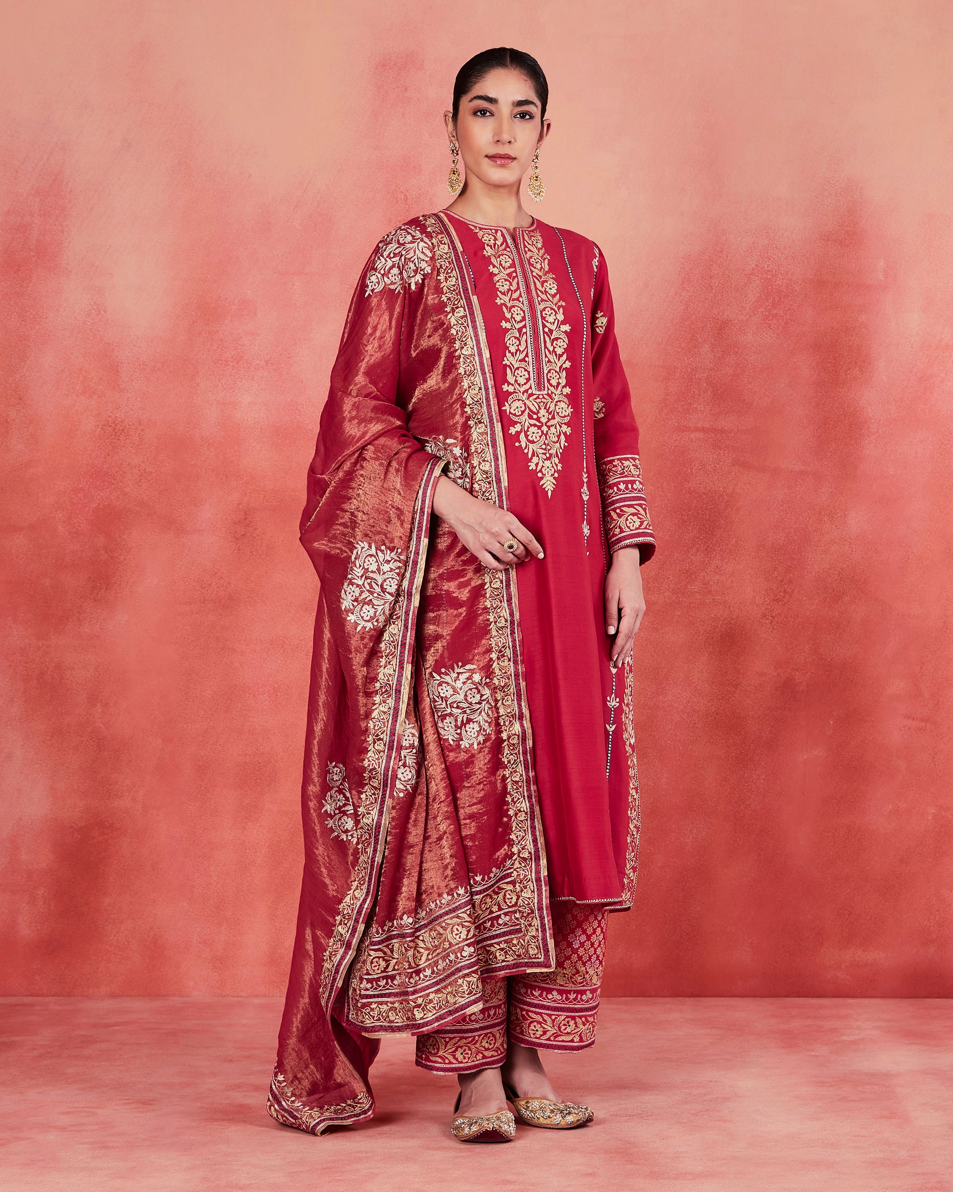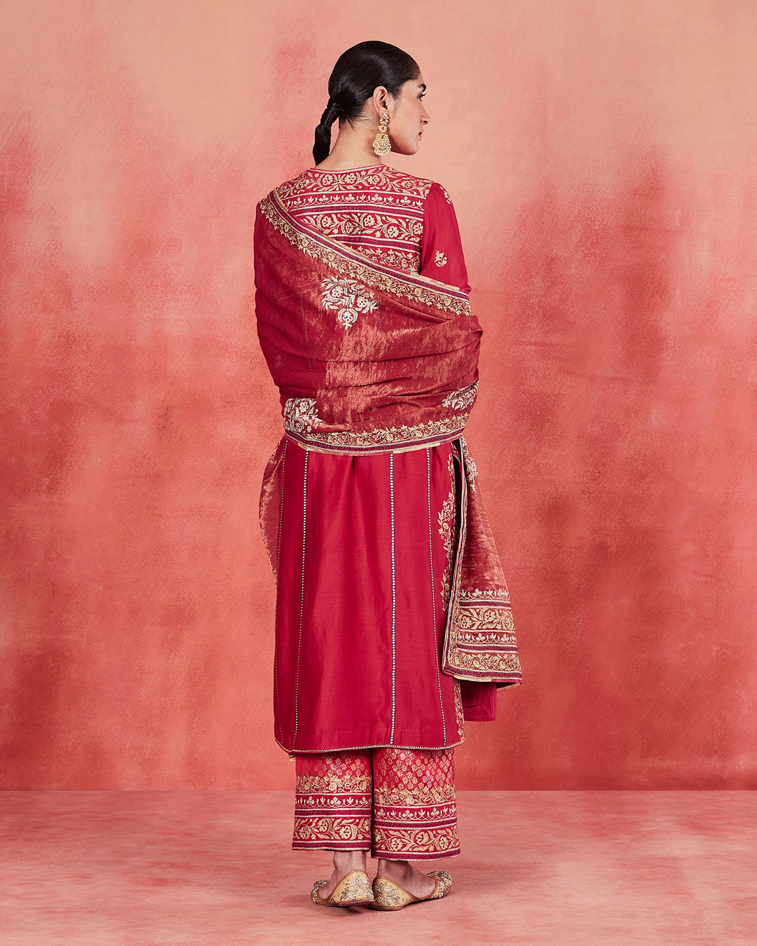 This red long panelled kurta in handwoven silk chanderi features a touch neckline, slit, and full sleeves. It pairs with matching Banarasi brocade straight-fit pants and a coordinating handwoven cotton tissue dupatta. It is adorned with aari embroidery in gold zari and multi-color silk threads. It is finished with matching piping and light gold lace, while the dupatta is finished with double-color piping.