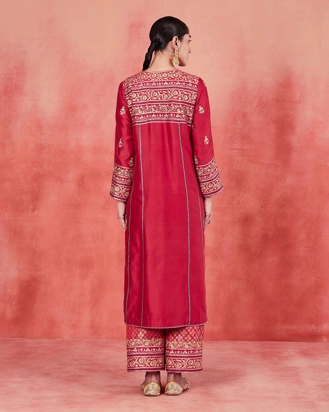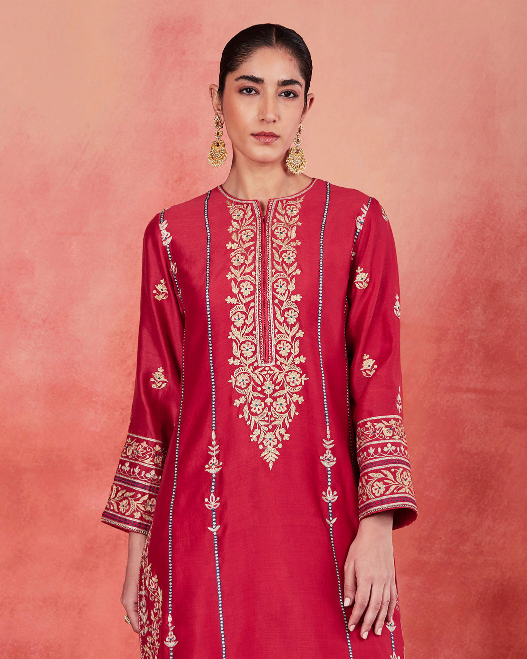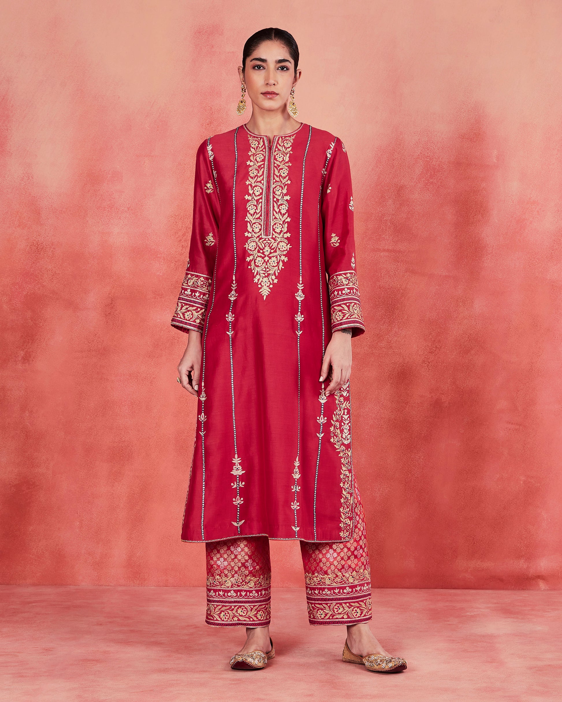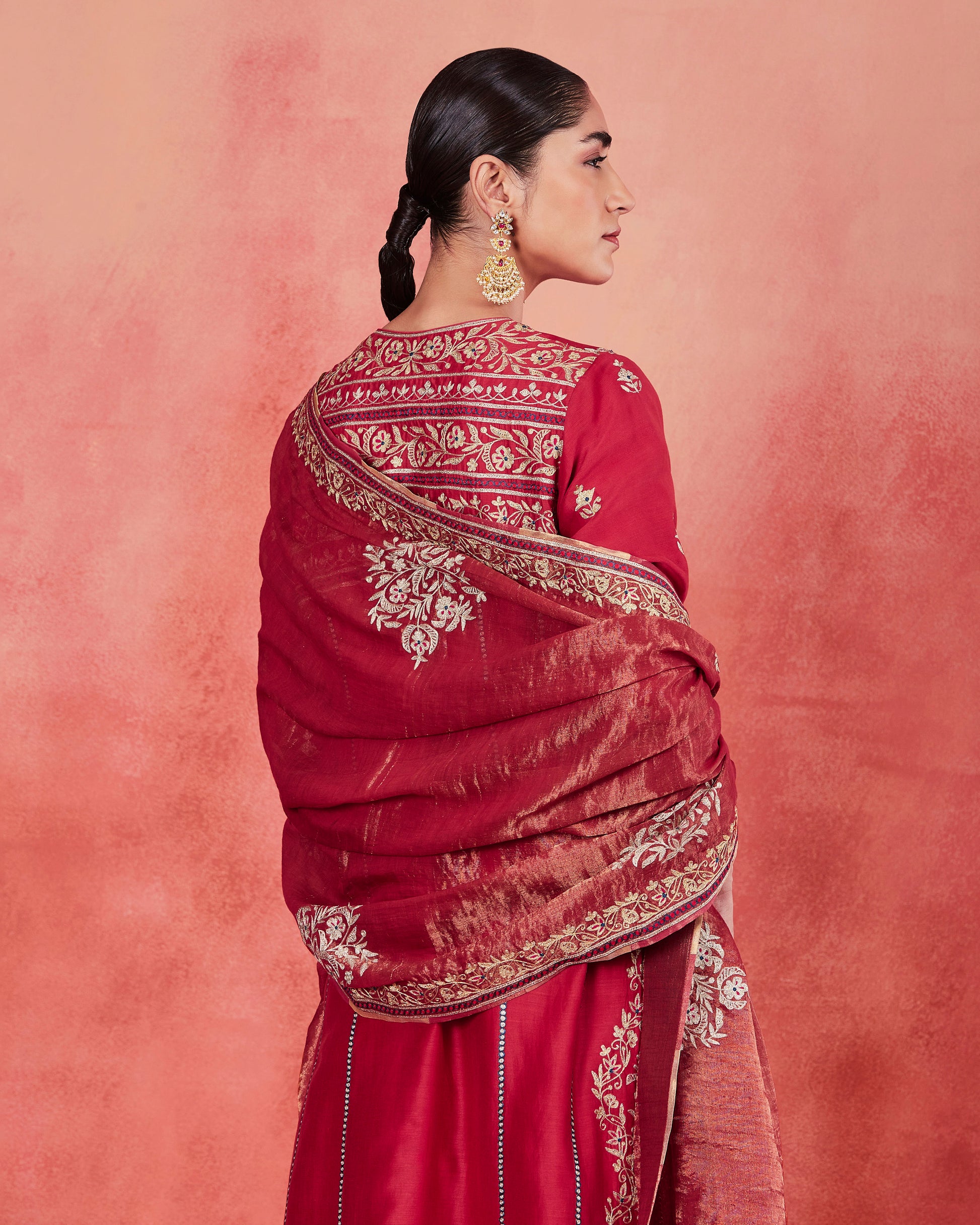 This red long panelled kurta in handwoven silk chanderi features a touch neckline, slit, and full sleeves. It pairs with matching Banarasi brocade straight-fit pants and a coordinating handwoven cotton tissue dupatta. It is adorned with aari embroidery in gold zari and multi-color silk threads. It is finished with matching piping and light gold lace, while the dupatta is finished with double-color piping.