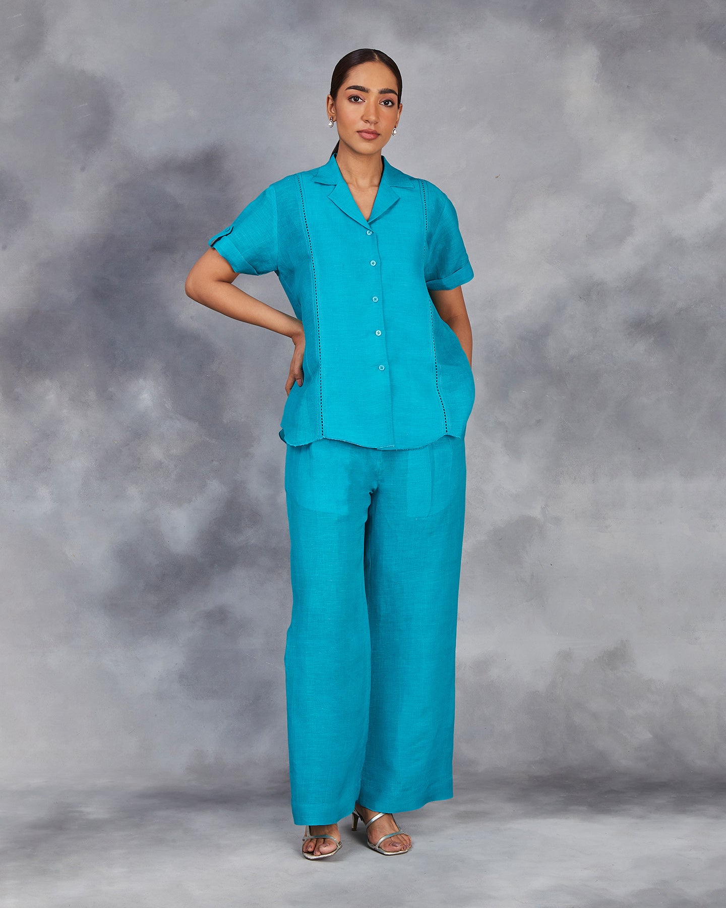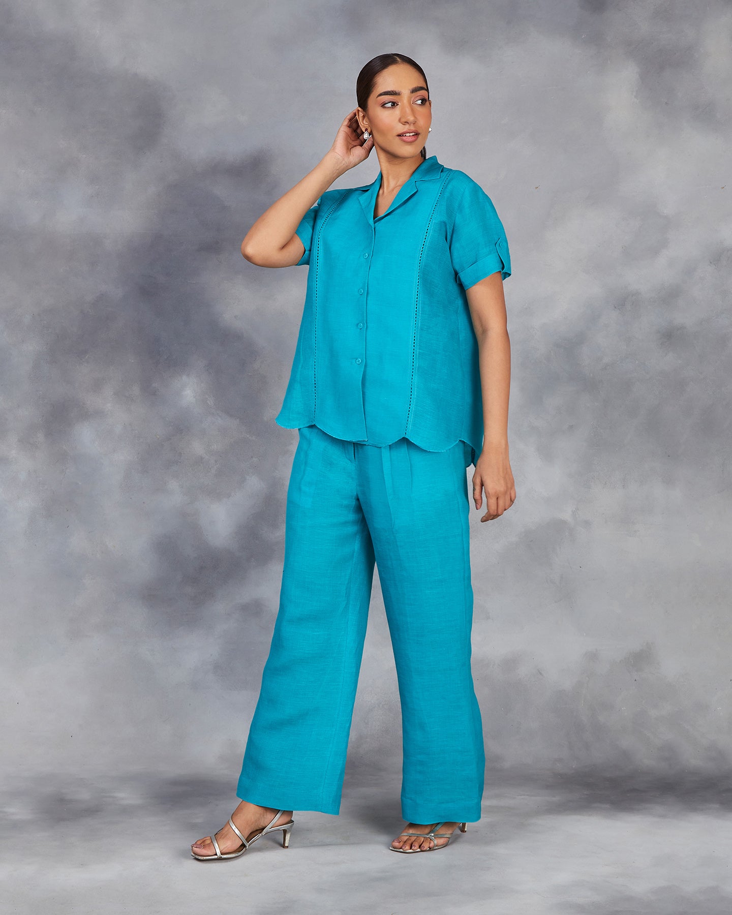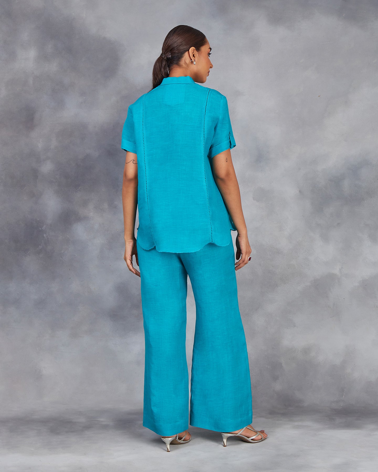 This is a striking teal blue pure linen co-ordinate set. The shirt has a safari neckline, rolled-up sleeves, and a buttoned placket in the front. It is adorned with delicate beading and scalloping. Paired with matching flared pants. This ensemble boasts a comfortable fit enhanced by stylish embellishments, creating a sophisticated and modern aesthetic.