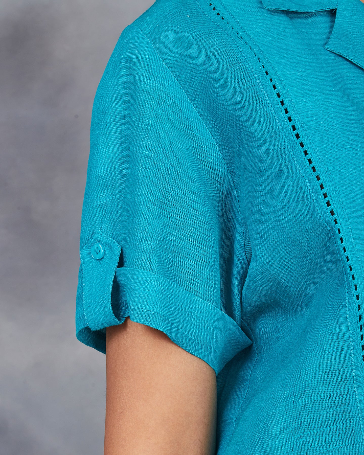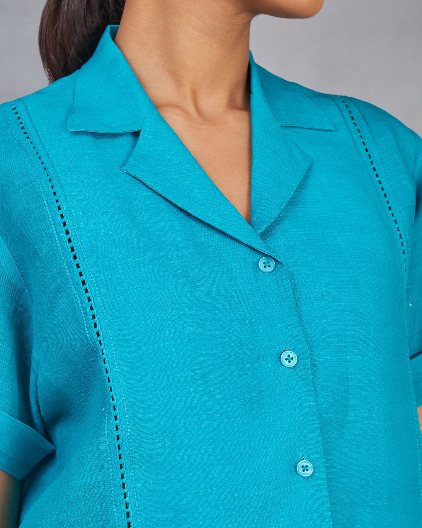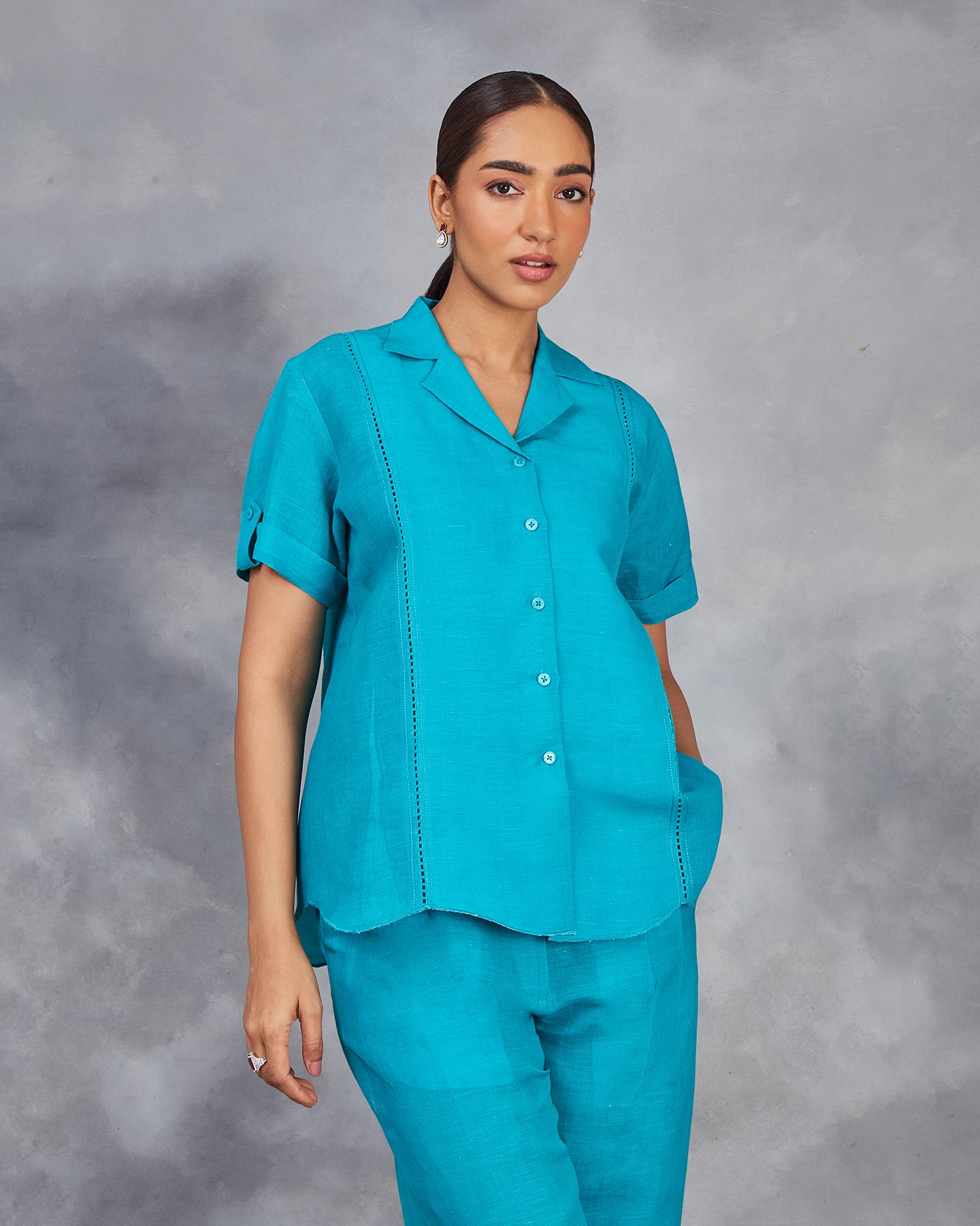 This is a striking teal blue pure linen co-ordinate set. The shirt has a safari neckline, rolled-up sleeves, and a buttoned placket in the front. It is adorned with delicate beading and scalloping. Paired with matching flared pants. This ensemble boasts a comfortable fit enhanced by stylish embellishments, creating a sophisticated and modern aesthetic.