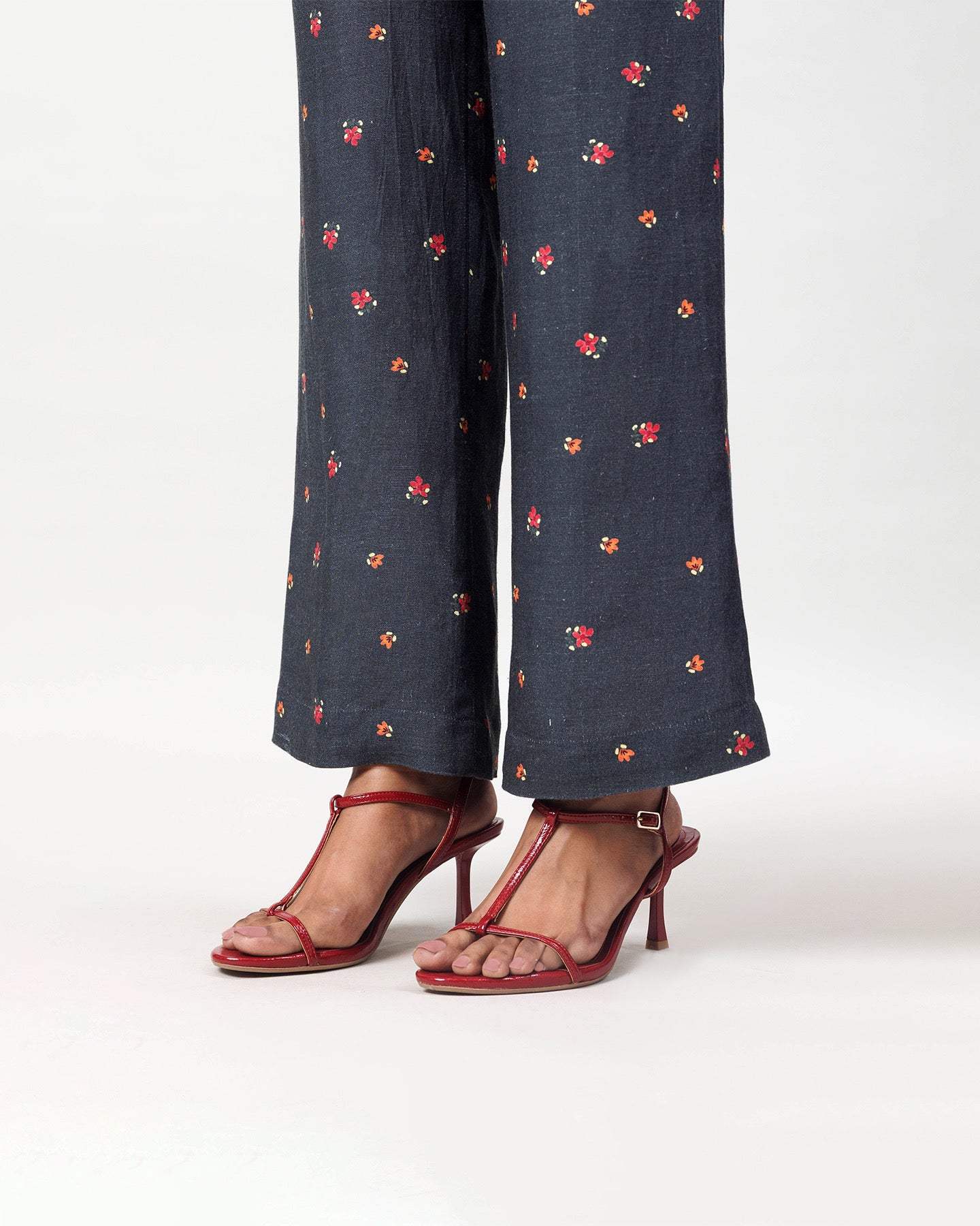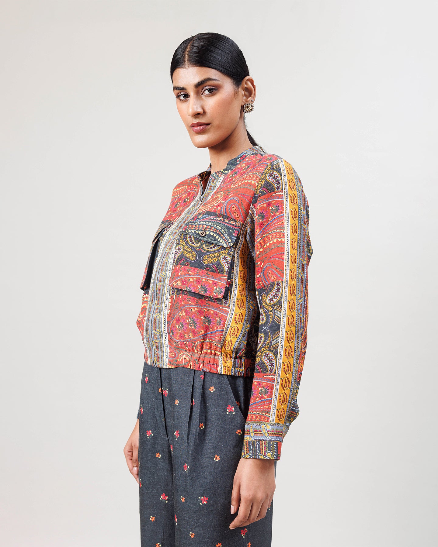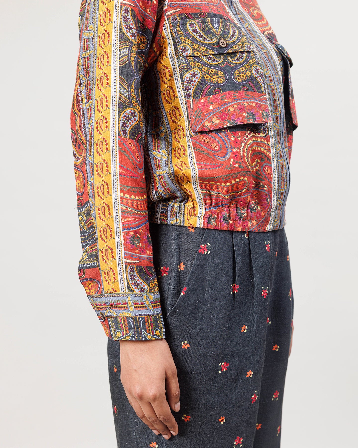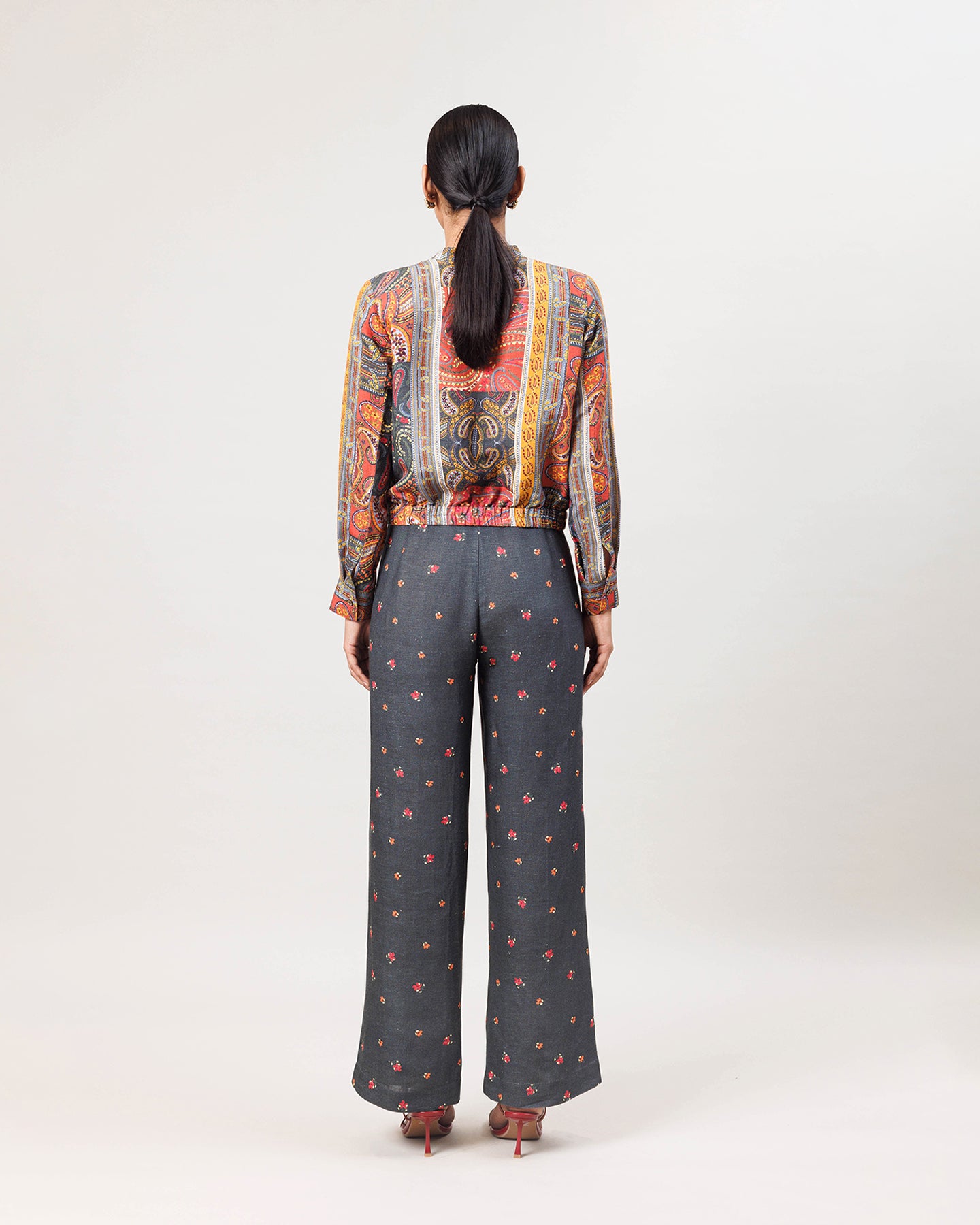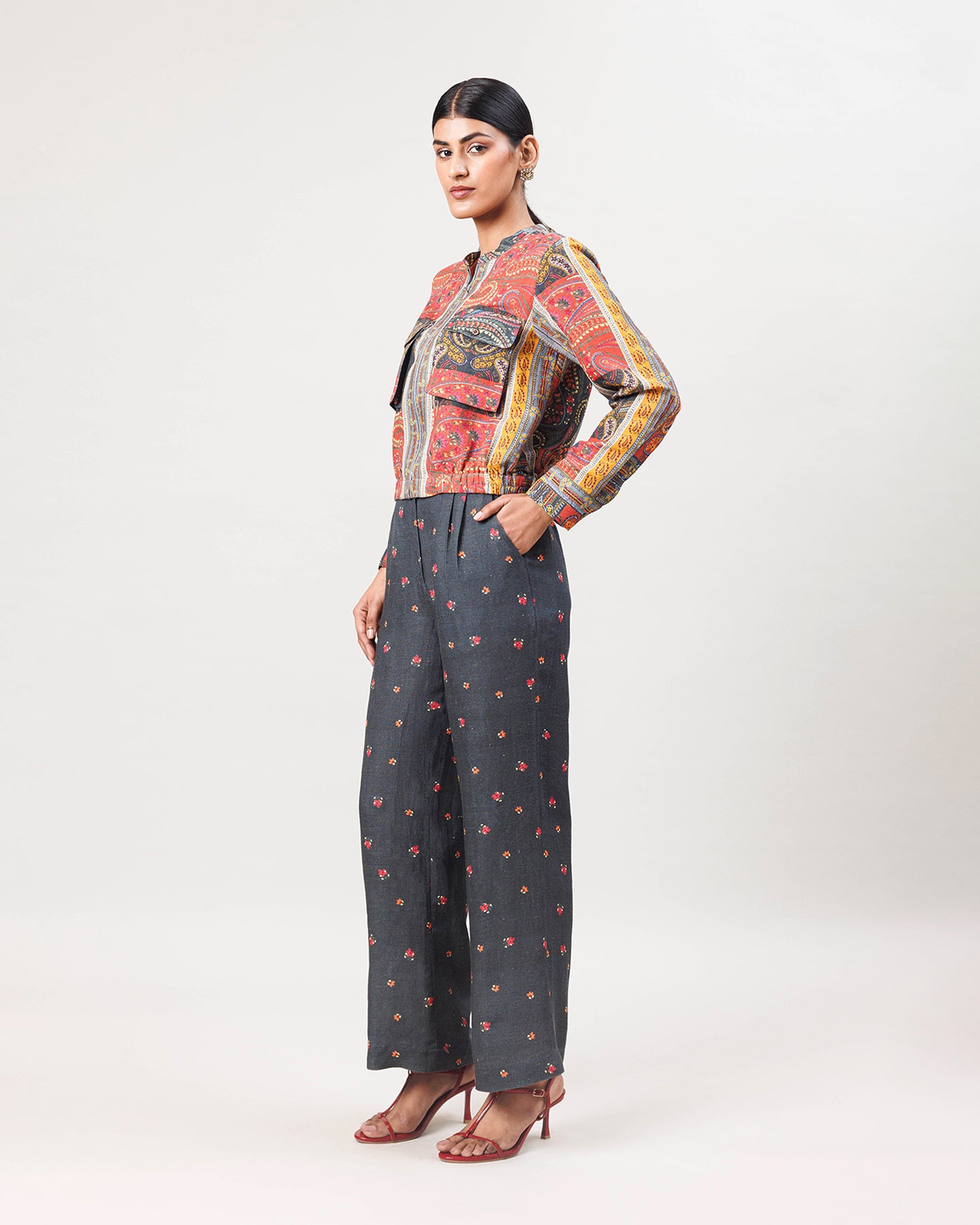 This is a bottle green pure linen co-ordinate set. The jacket features a mandarin collar, a front zip, pockets, elasticated hem, and cuff sleeves. It is paired with straight-fit pants featuring functional side pockets. The set showcases an exclusive in-house Sue Mue print beautifully inspired by traditional paisley stripes and ditsy floral motifs.
