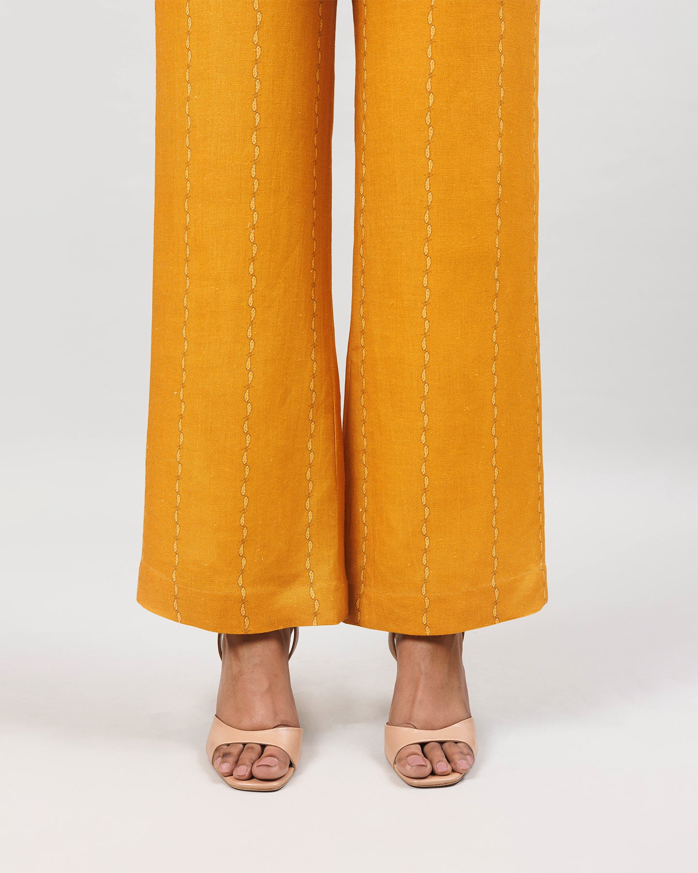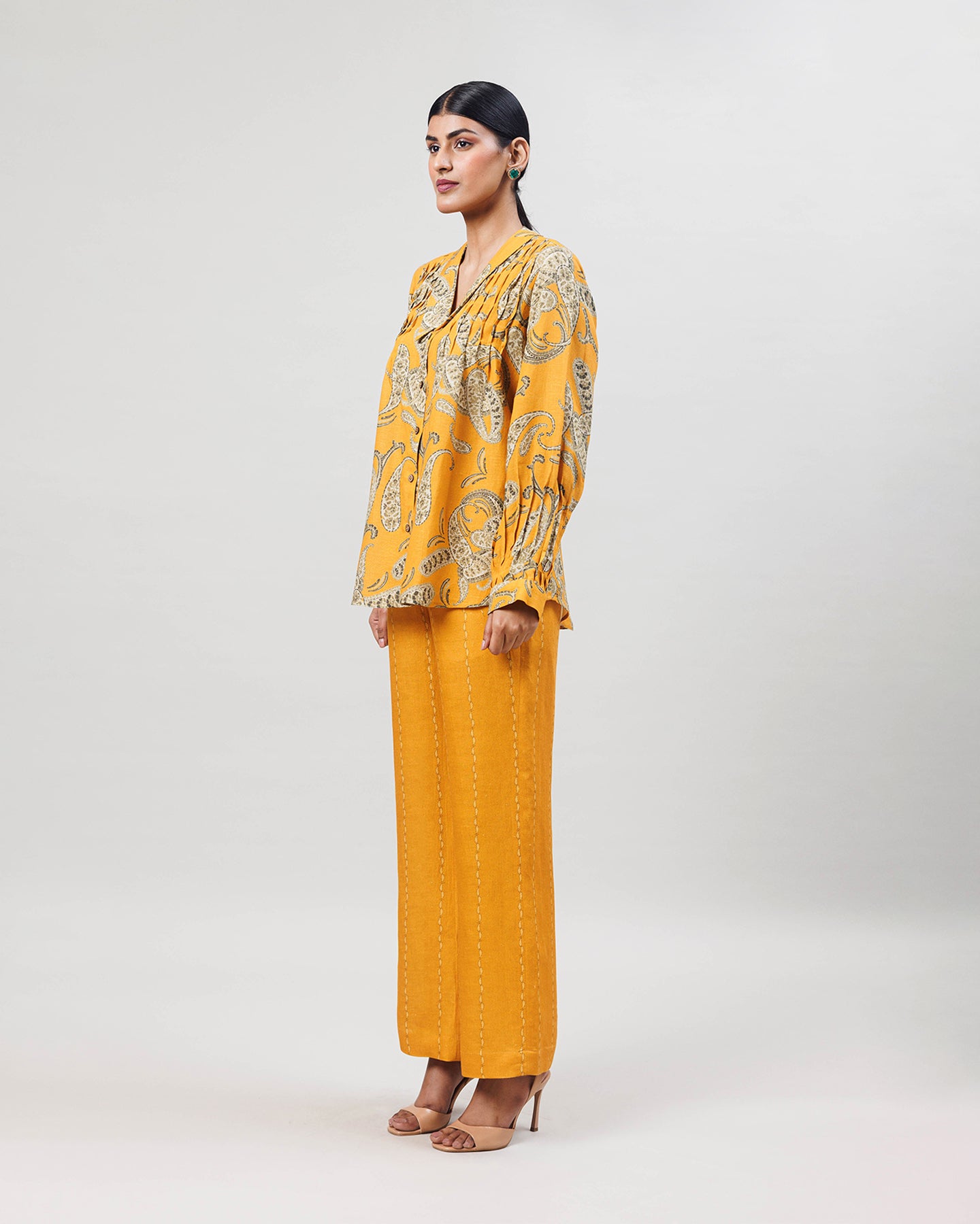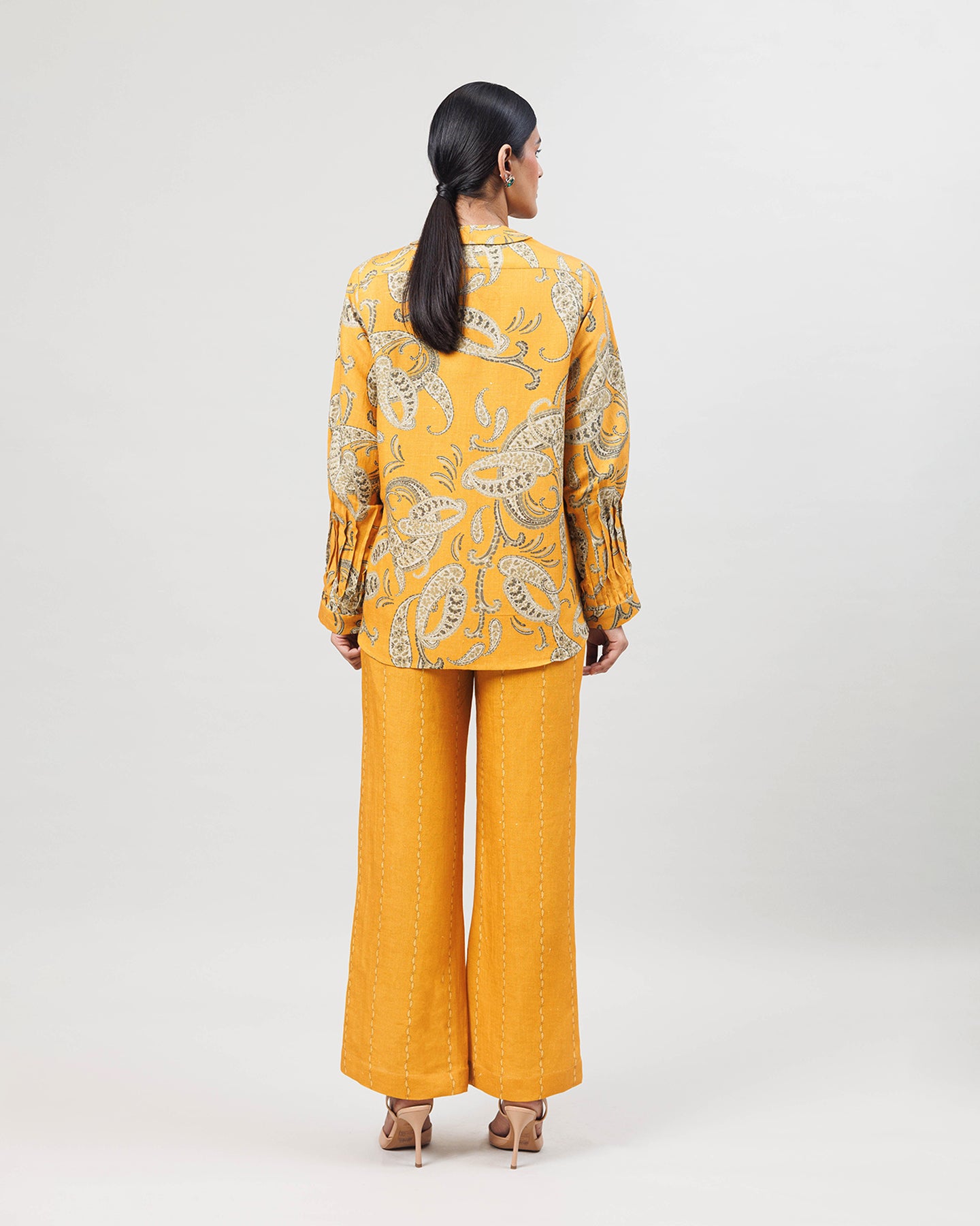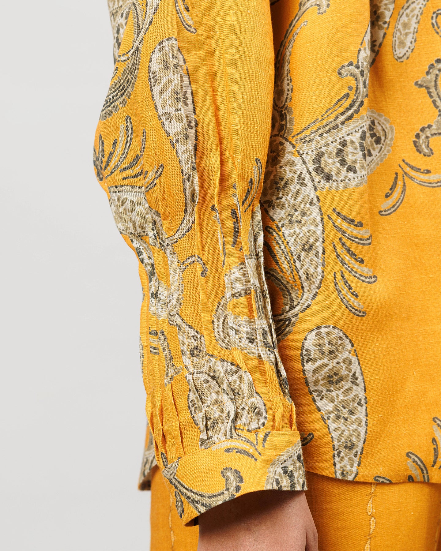 This is a mustard pure linen co-ordinate set. The loose-fit shirt features a Chelsea collar, a front placket with wooden buttons, twisted tuck detailing, and cuff sleeves. It is paired with straight-fit pants featuring functional side pockets. The set showcases an exclusive in-house Sue Mue print beautifully inspired by traditional paisley and chain stripes.