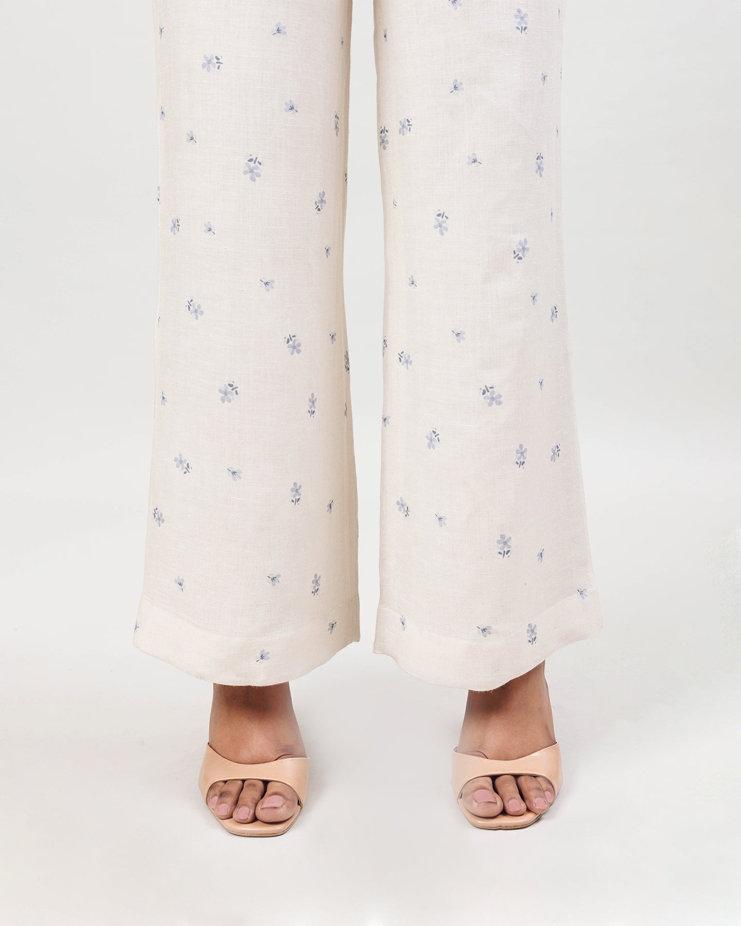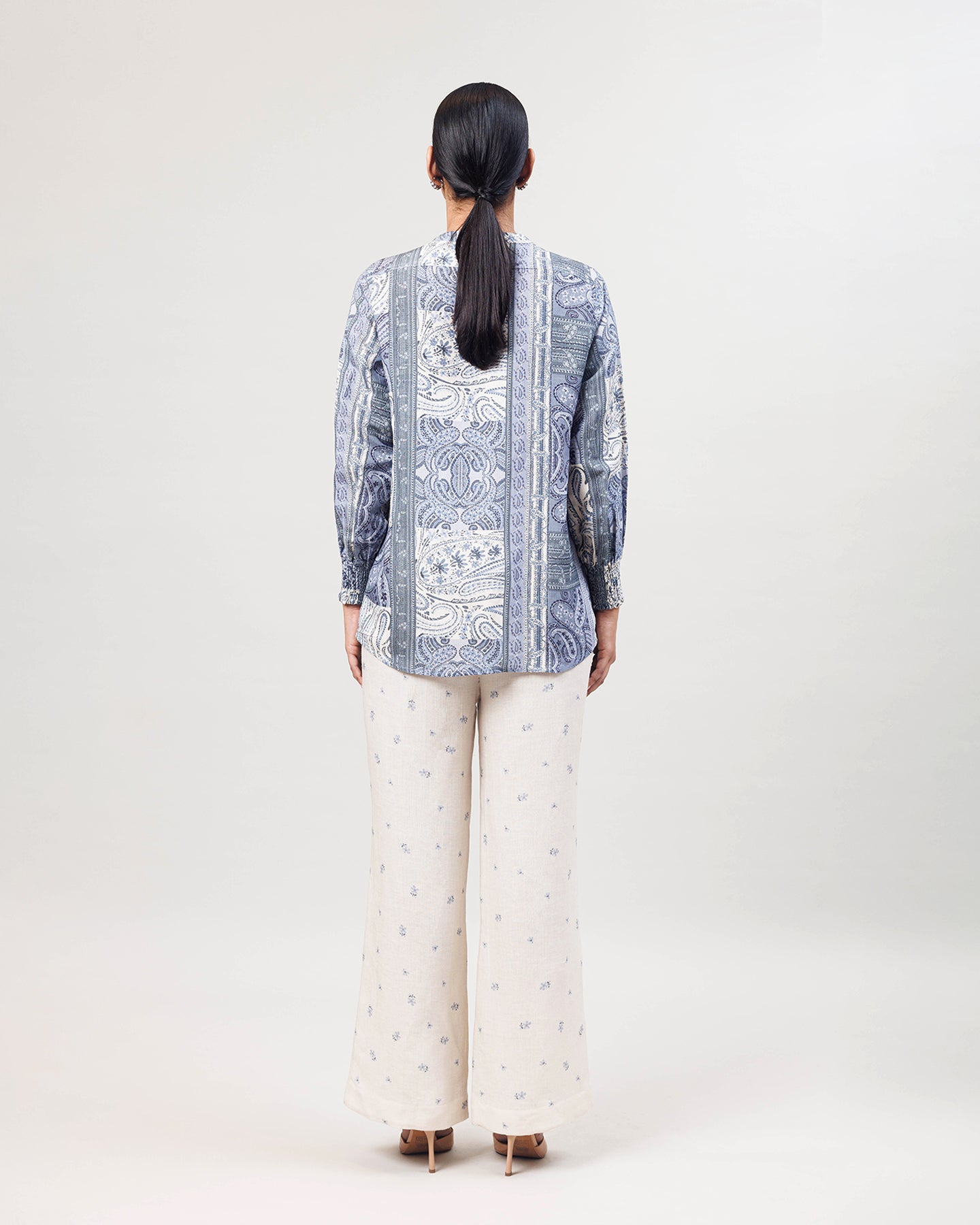 This is an off-white pure linen co-ordinate set. The shirt features a V-neckline with a band collar and smocked cuff sleeves. It is paired with straight-fit pants featuring functional side pockets. The set showcases an exclusive in-house Sue Mue print beautifully inspired by traditional paisley stripes and ditsy floral motifs.