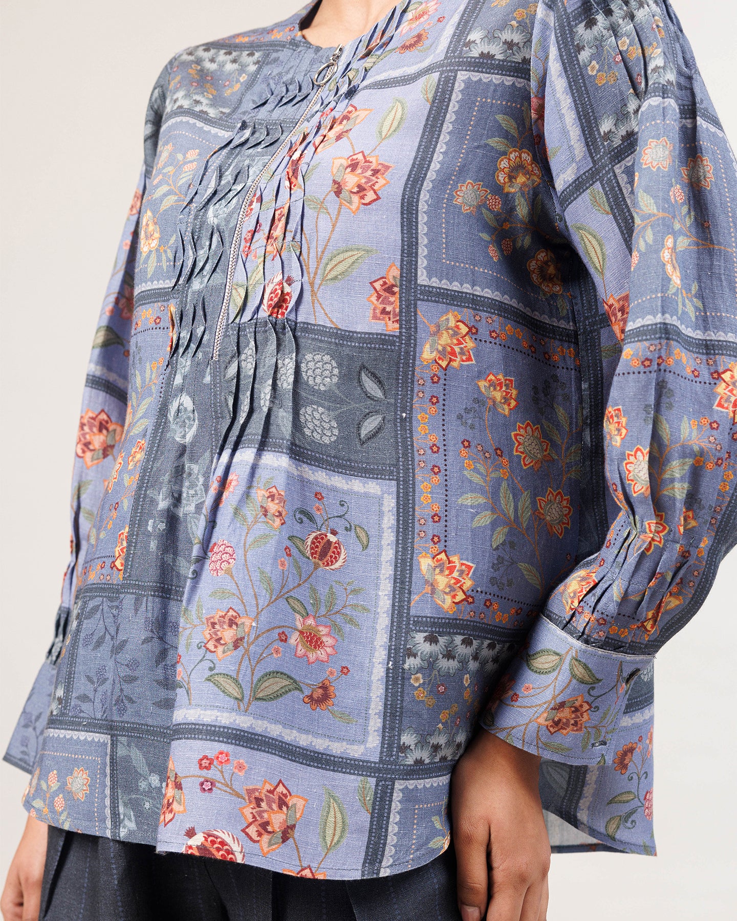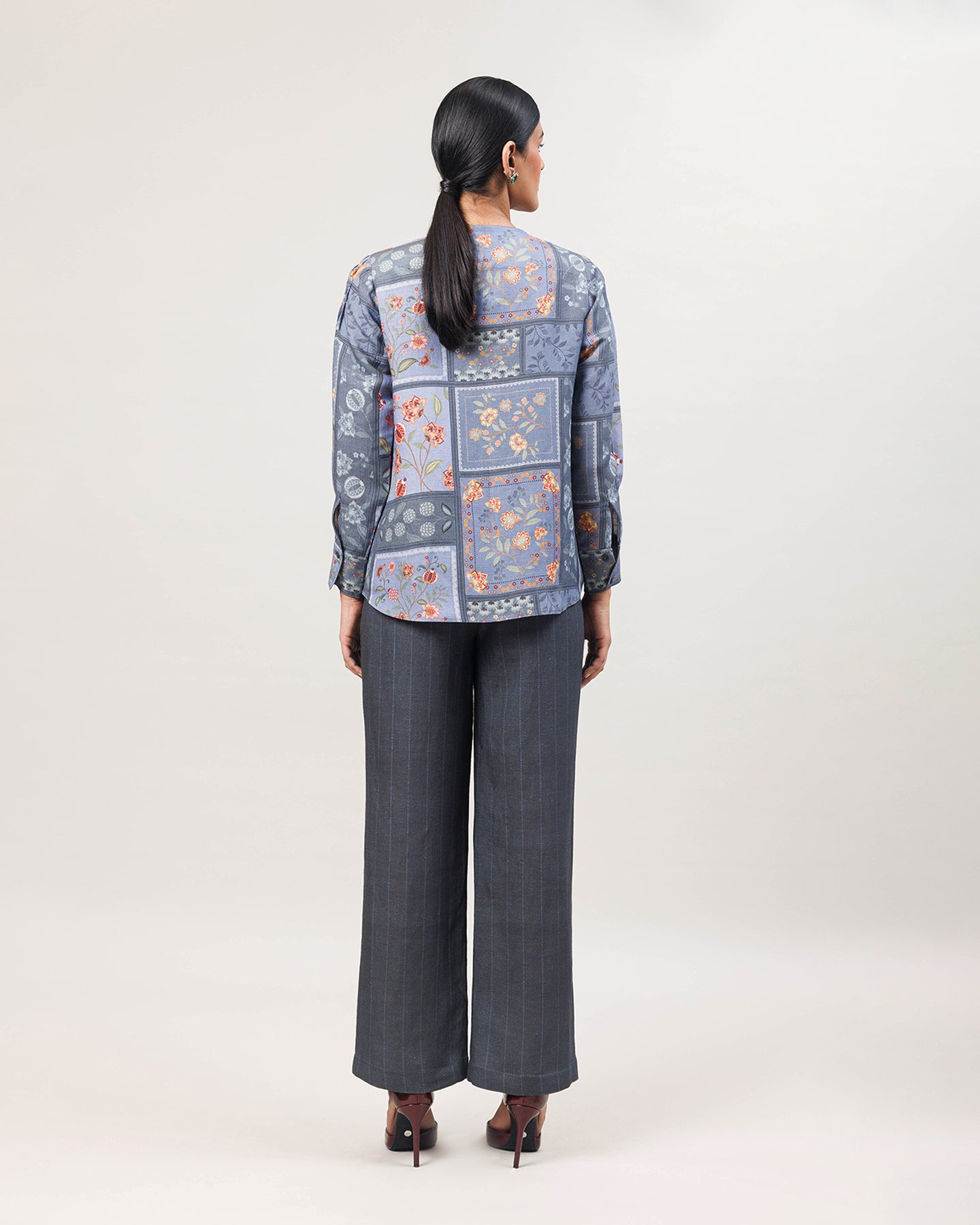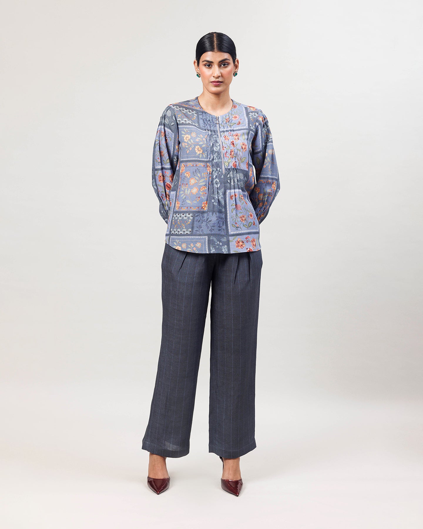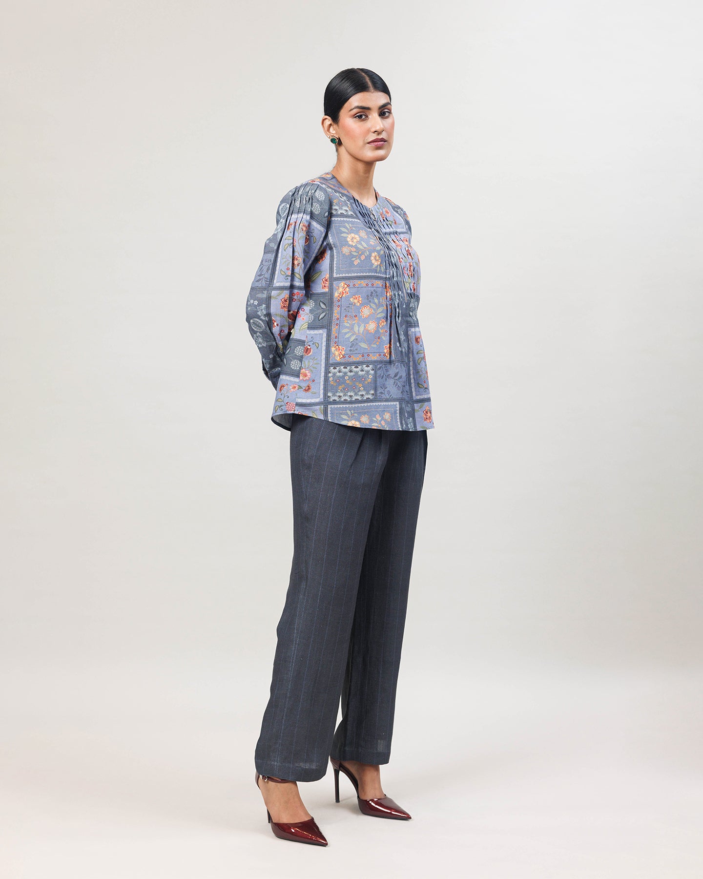 This is a charcoal grey co-ordinate set. The steel grey top features a touch neckline with a centre zip, twisted tuck detailing, and full cuff sleeves. It comes with a pair of straight-fit pants with functional pockets. The set showcases an exclusive in-house Sue Mue print beautifully inspired by floral patchwork and dotted stripes.