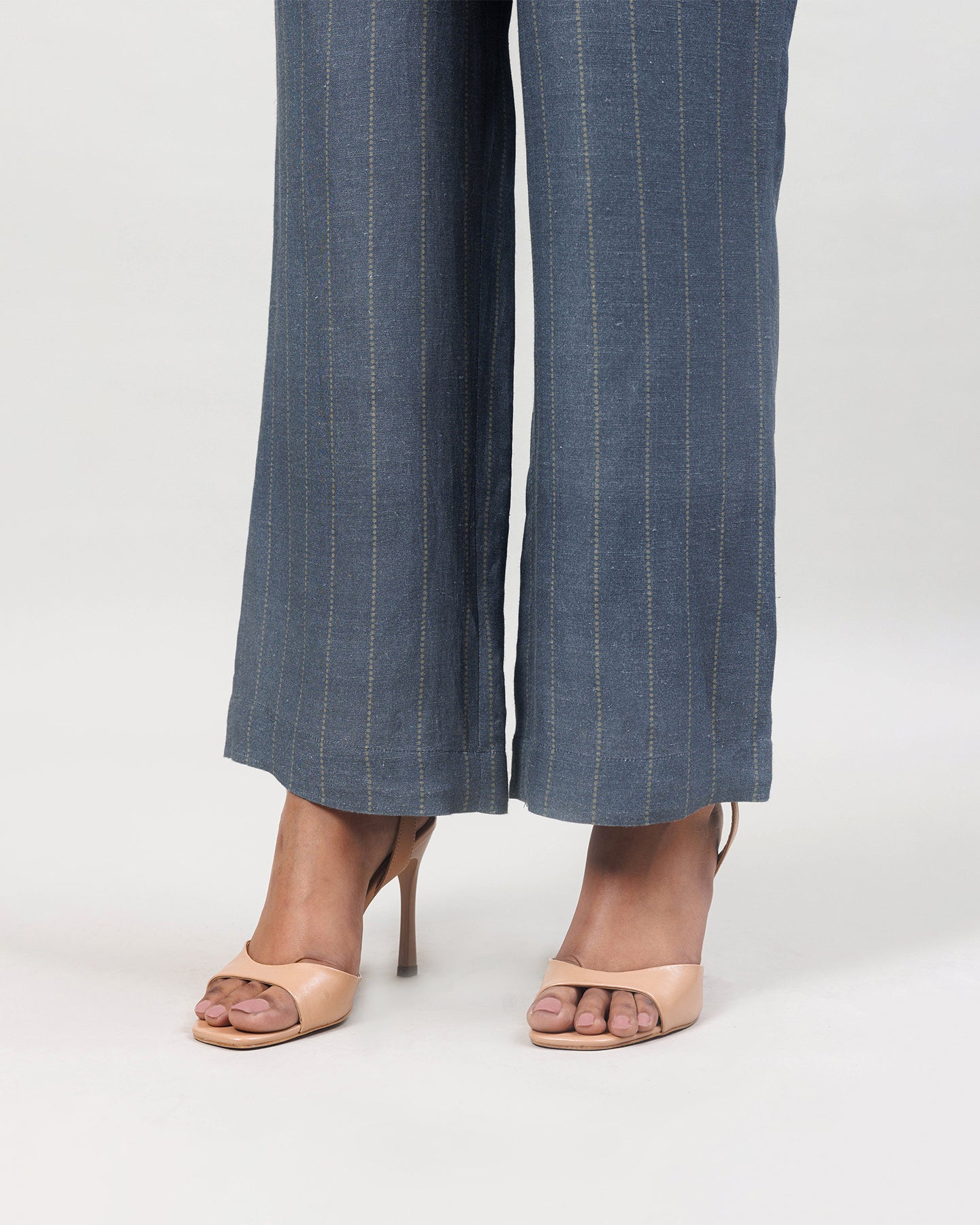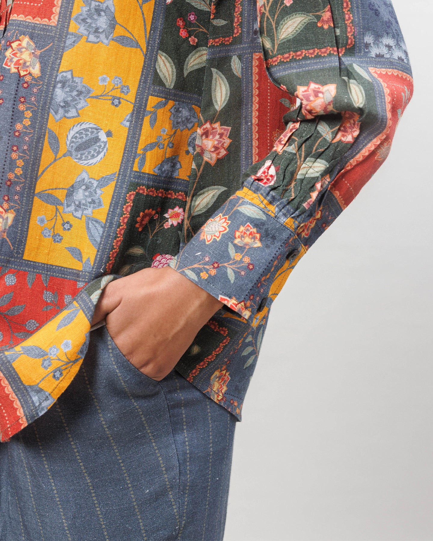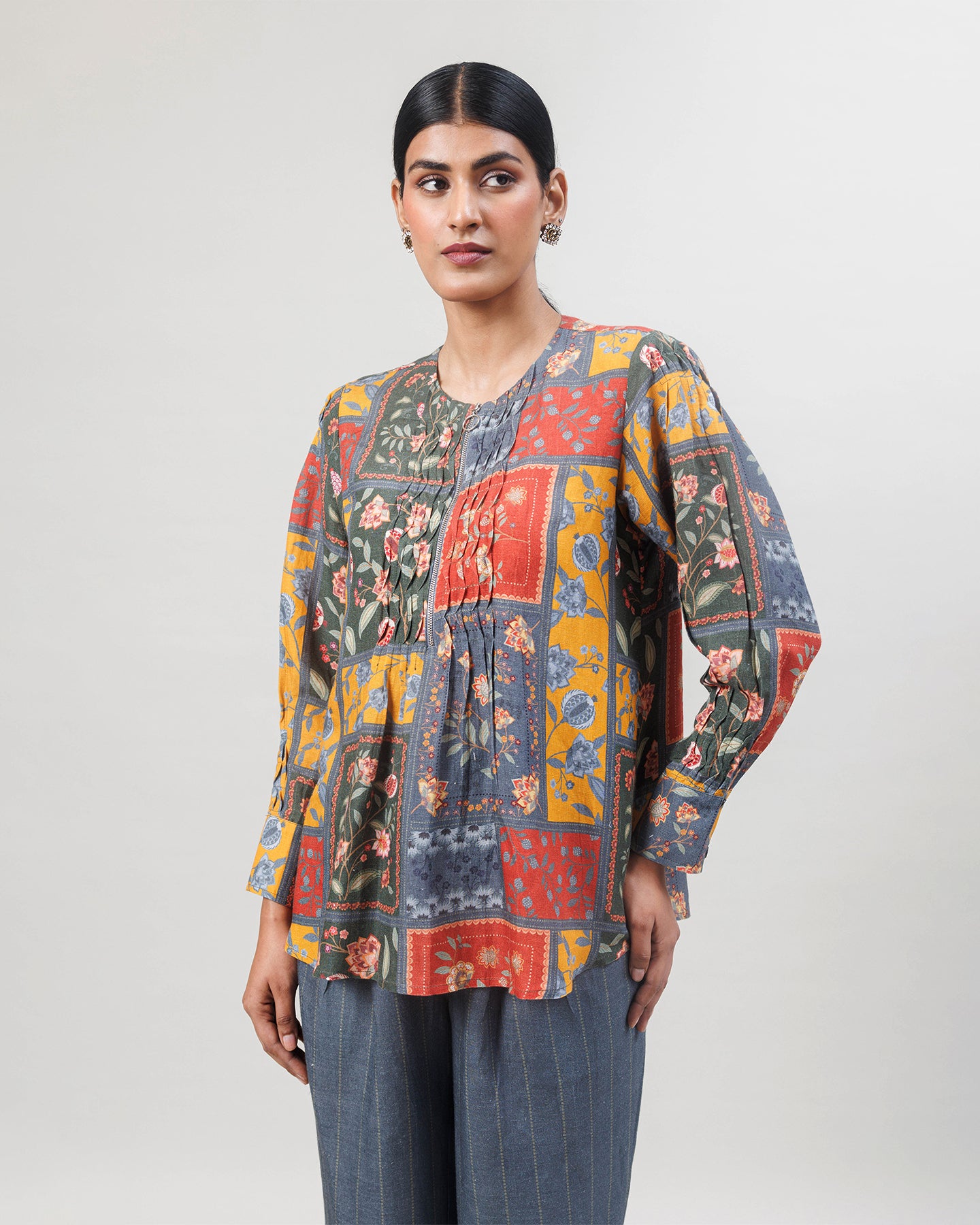 This is a grey co-ordinate set. The steel grey top features a touch neckline with a centre zip, twisted tuck detailing, and full cuff sleeves. It is paired with straight-fit pants featuring inverted pleats and side pockets. The set showcases an exclusive in-house Sue Mue print beautifully inspired by floral patchwork and dotted stripes.