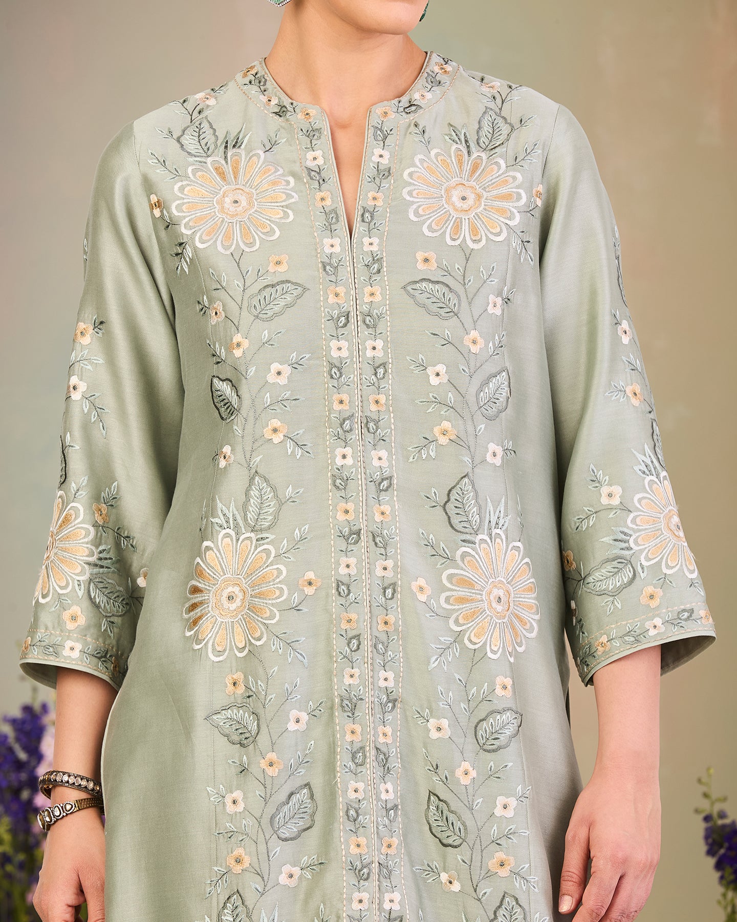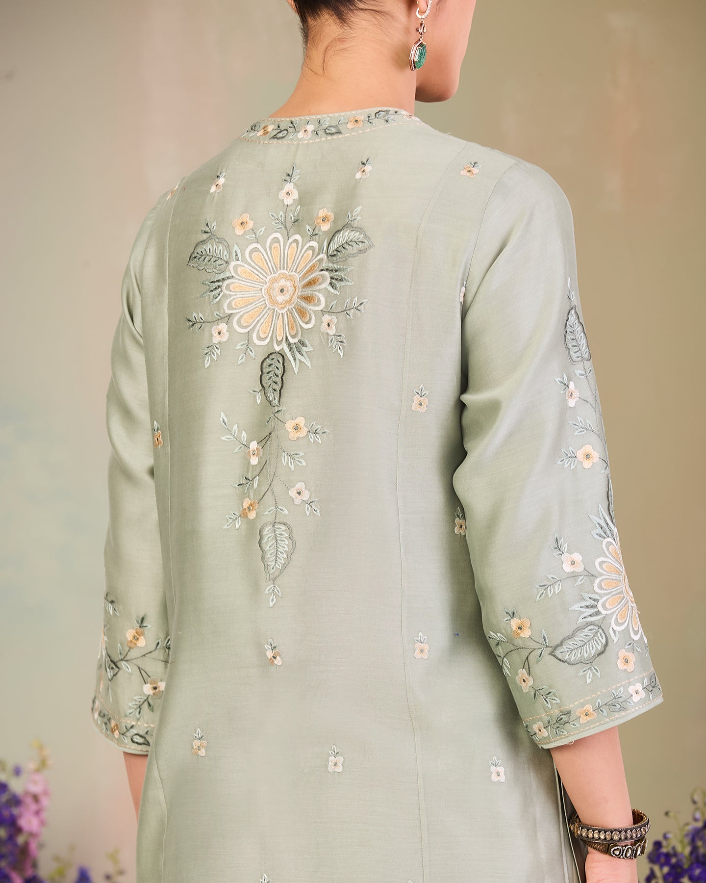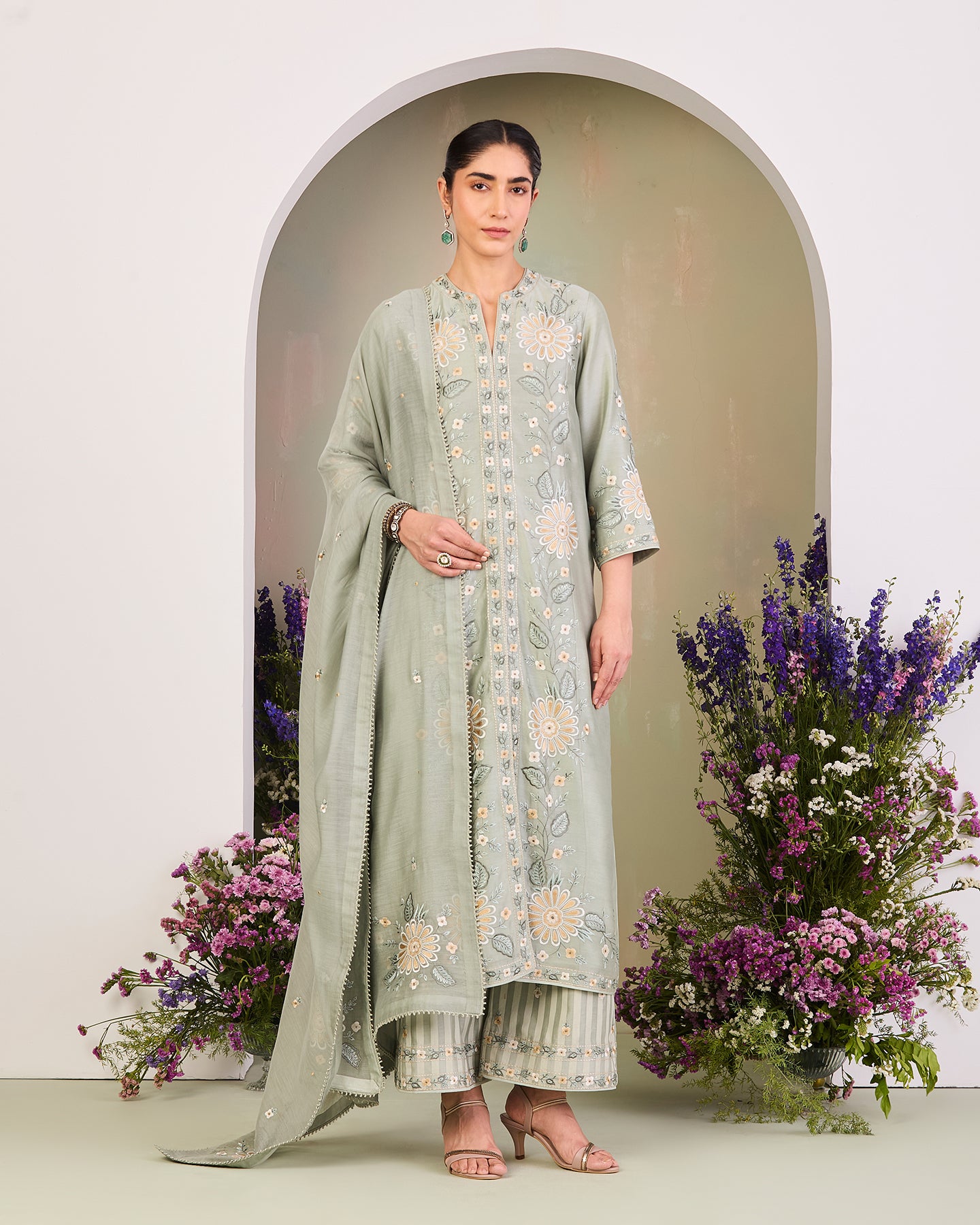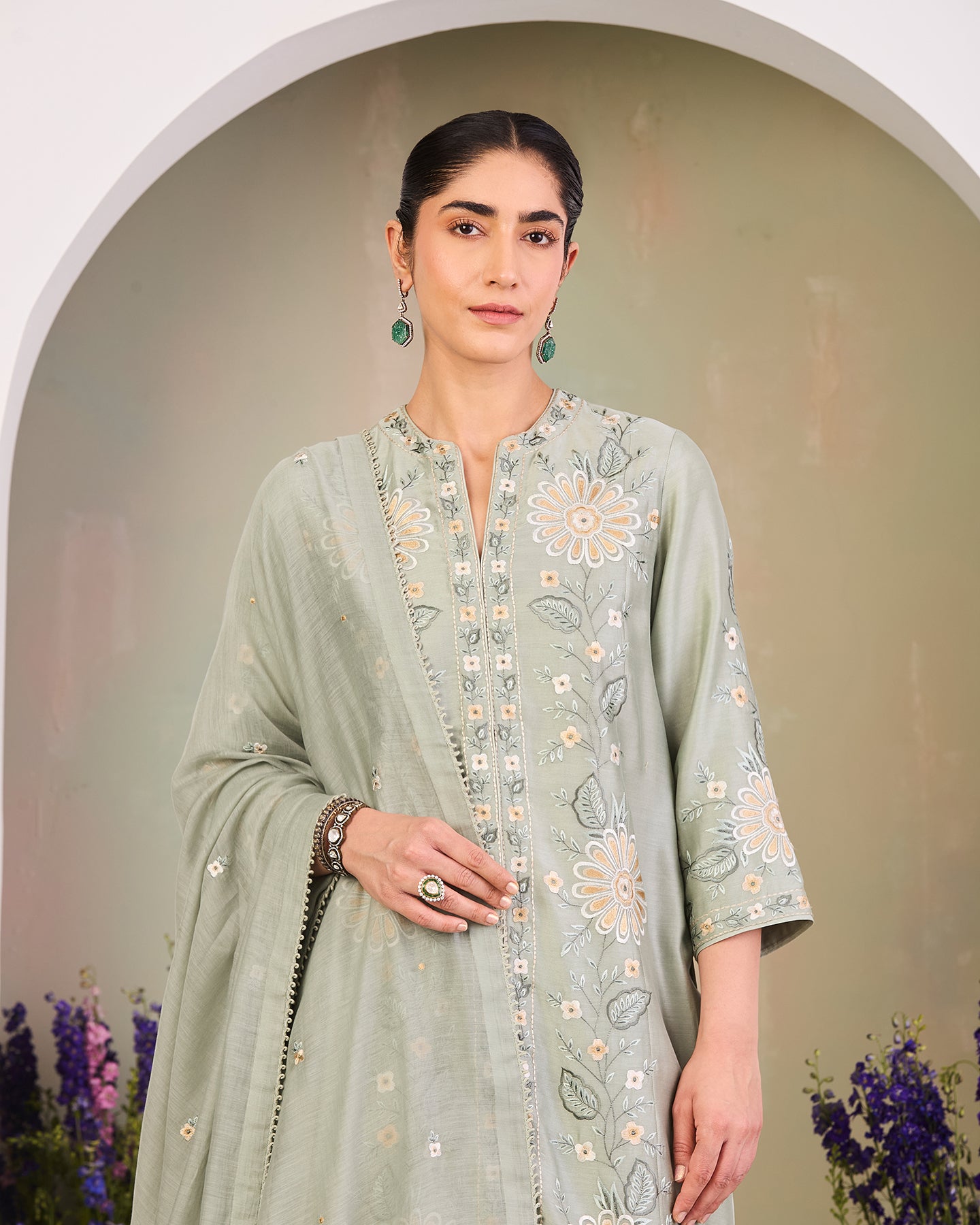 This is a sage green handwoven silk chanderi long kurta with a round neck, small slit in front and three-quarter sleeves. It comes with a pair of matching loose-fit pants and a handwoven chanderi mulmul dupatta. The set is decorated with floral motifs embroidered using multi-colour silk threads. Finished with matching piping and lace detailing.