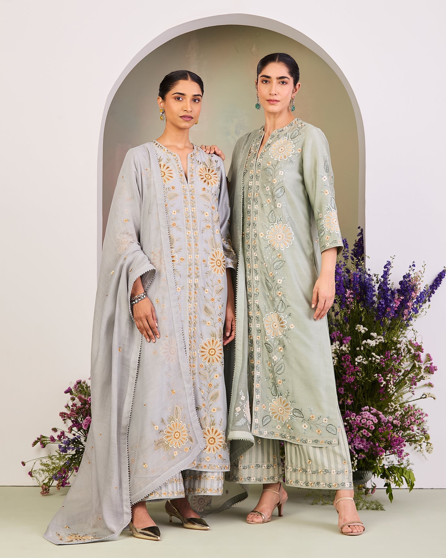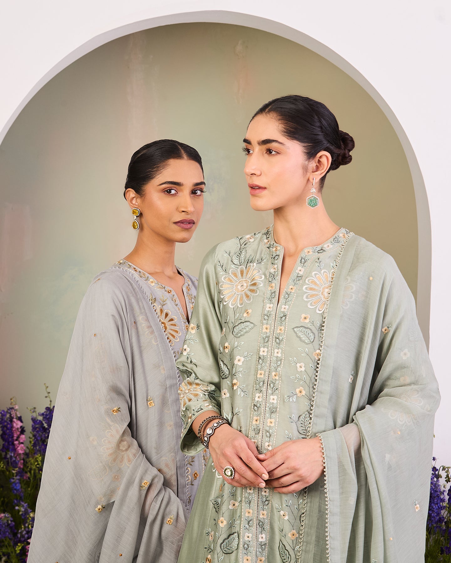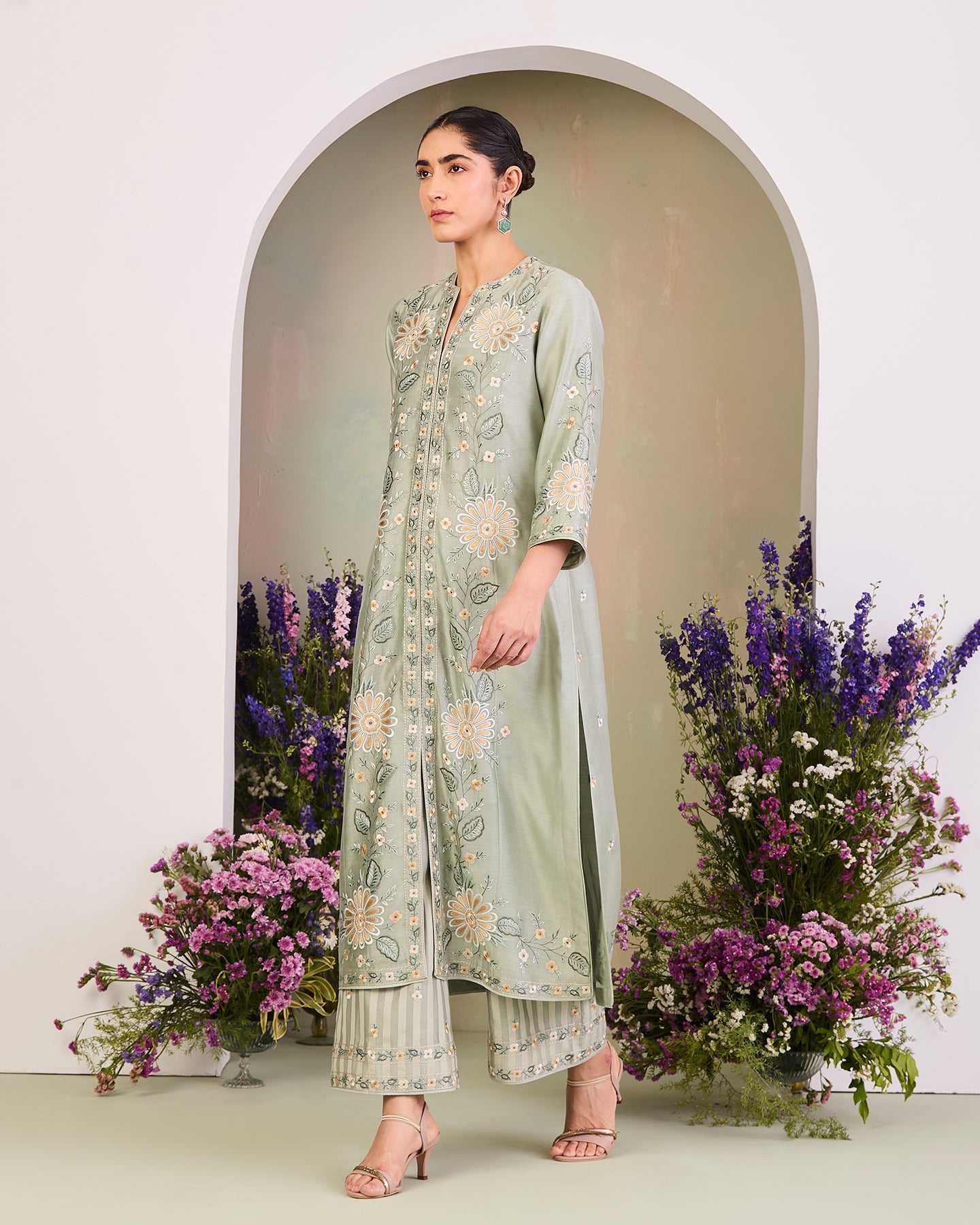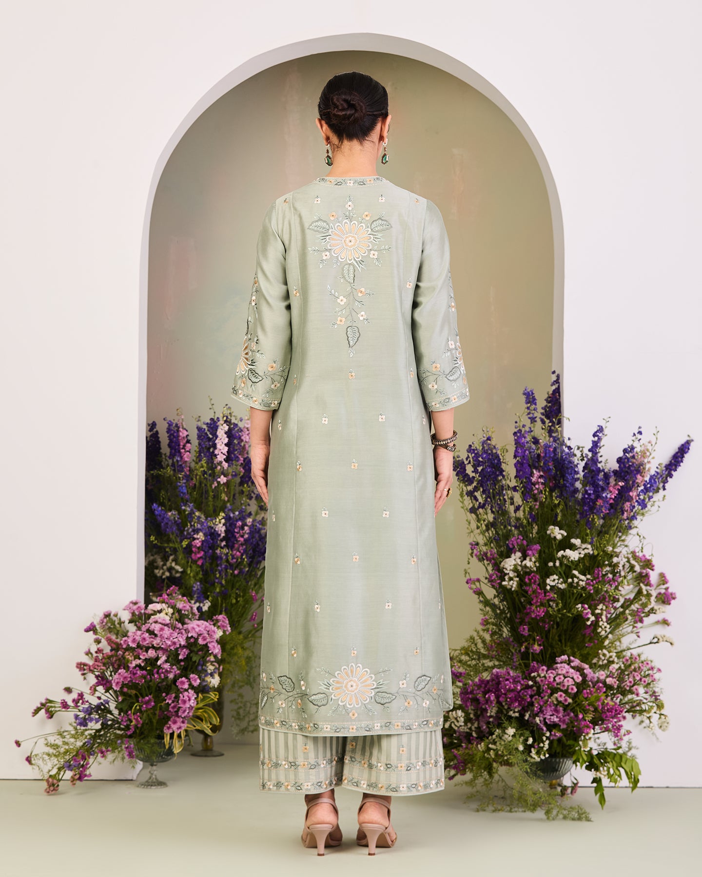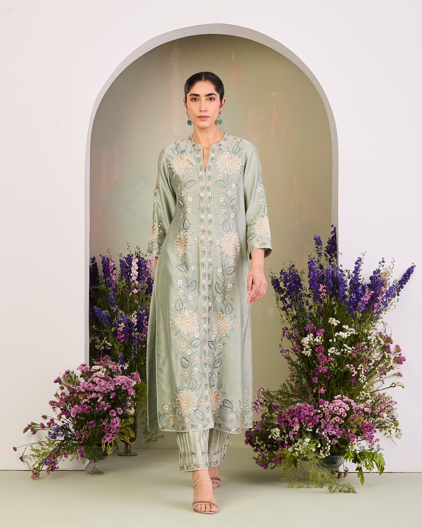 This is a sage green handwoven silk chanderi long kurta with a round neck, small slit in front and three-quarter sleeves. It comes with a pair of matching loose-fit pants and a handwoven chanderi mulmul dupatta. The set is decorated with floral motifs embroidered using multi-colour silk threads. Finished with matching piping and lace detailing.