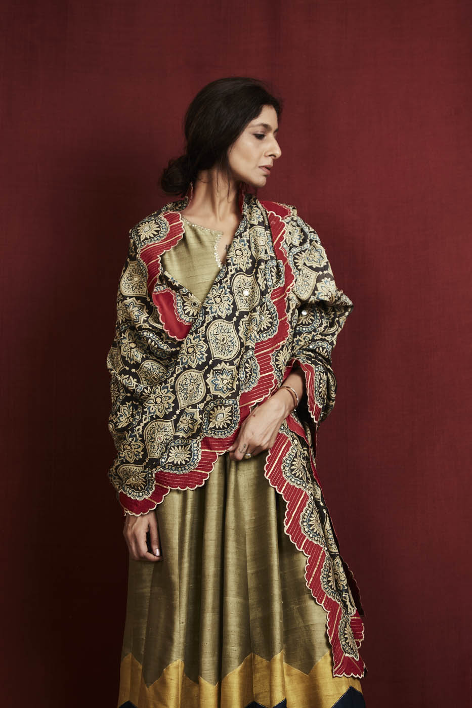 Featuring a chevron detail olive green raw silk anarkali with churidar and a grey silk printed dupatta.