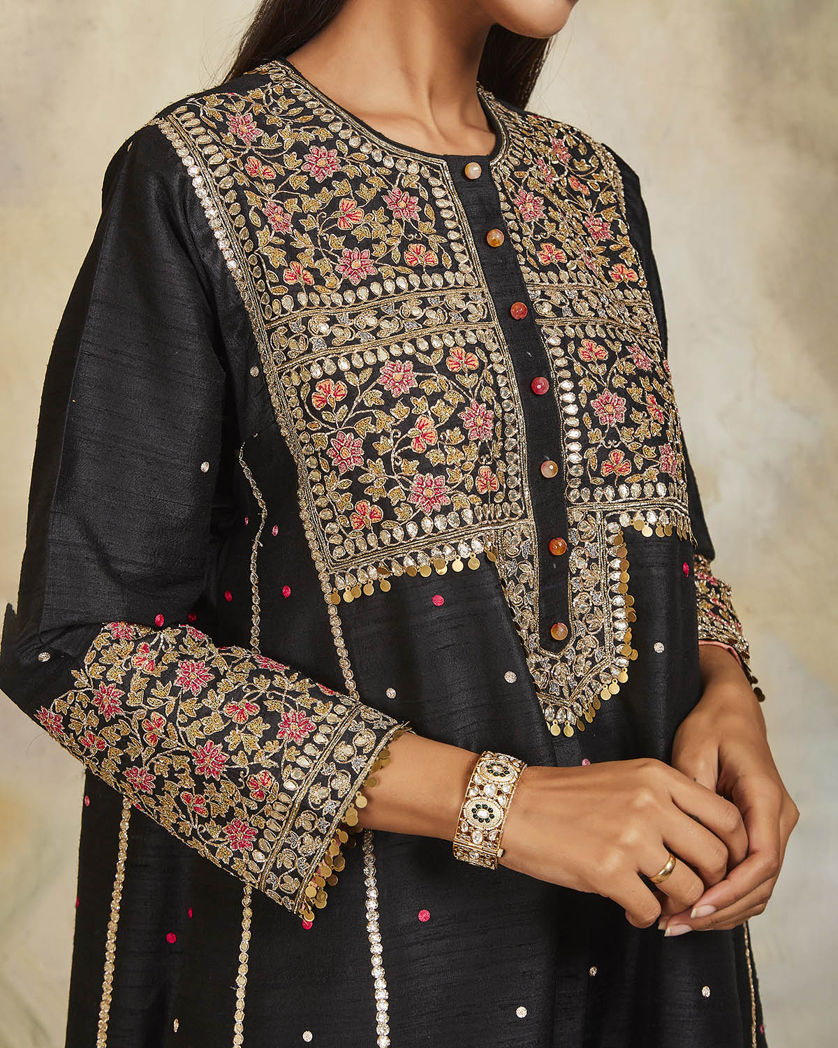 This black raw silk panelled kurta has been enhanced with zari and dabka work. It comes with a pair of matching lycra georgette churidar and an embroidered organza dupatta.