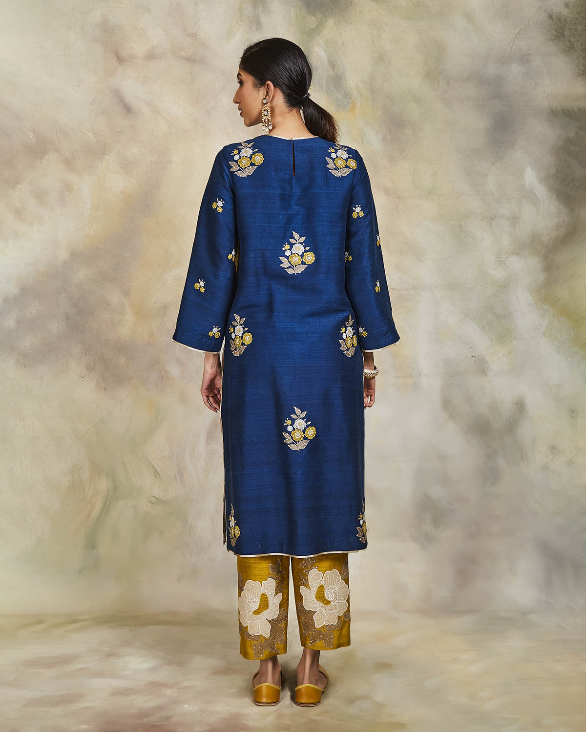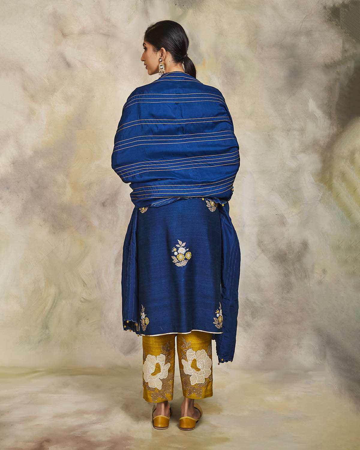 This mid-night blue raw silk kurta haas been enhanced with appliqued floral butis and sequins. It comes with a pair of embroidered mustard silk pants and an embroidered mid-night blue silk dupatta.