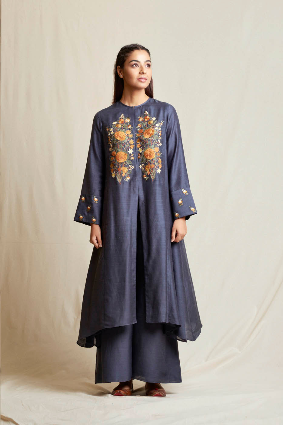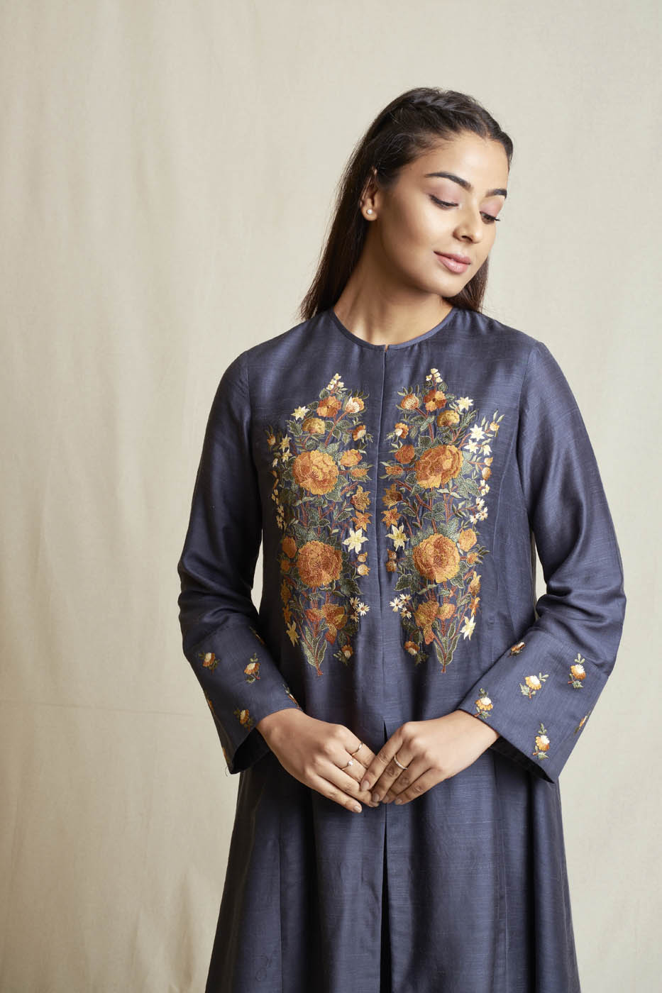 Featuring an ash grey kalidar kurta in tussar georgette with silk thread embroidery along with pants.