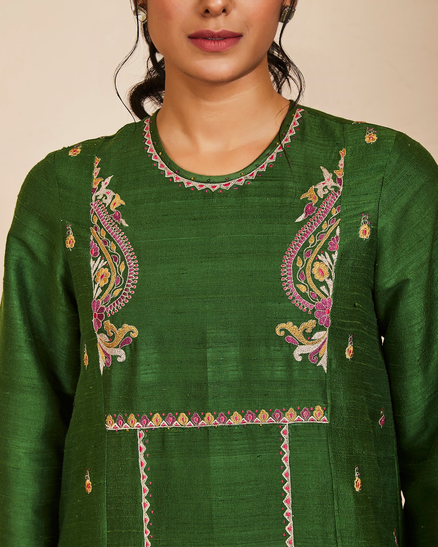 This is a green raw silk six kali kurta with a pair of wine pants and a silk dupatta. All finely embroidered with silk threads.