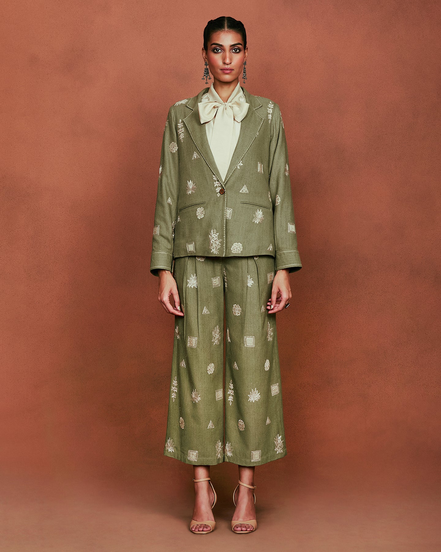 This is an olive green matka silk co-ordinate set. The blazer features a notched lapel, cuff sleeves, and front pockets. It is paired with loose fit pants featuring front pleats and functional side pockets. The set is adorned with tribal inspired floral and geometric motifs. Handcrafted using appliqué work, silk thread embroidery, and cotton thread running stitch embroidery. It is best paired with our silk shirt/top.