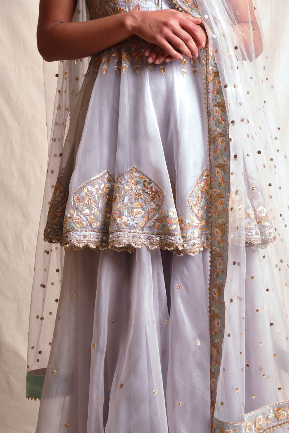 This set features a grey organza short kalidar with a dupatta and an organza sharara. All enhanced with fine embroidery.