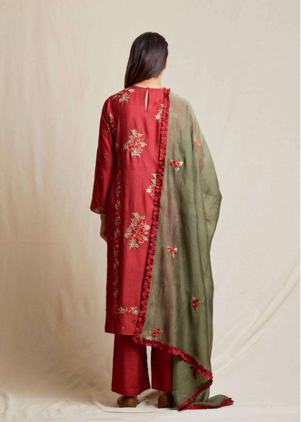 This set features embroidered tussar georgette suit with silk thread work. It is paired with plain palazzos. It comes along with embroidered silk cotton dupatta enhanced with a frill on the border.
