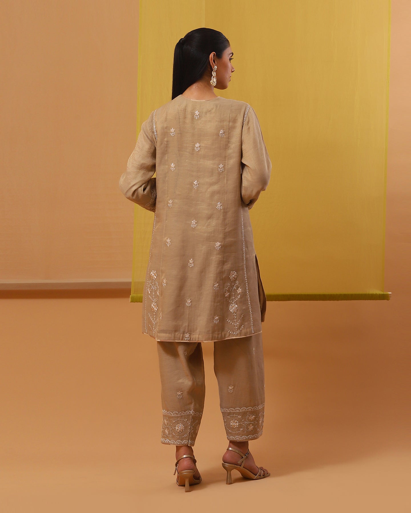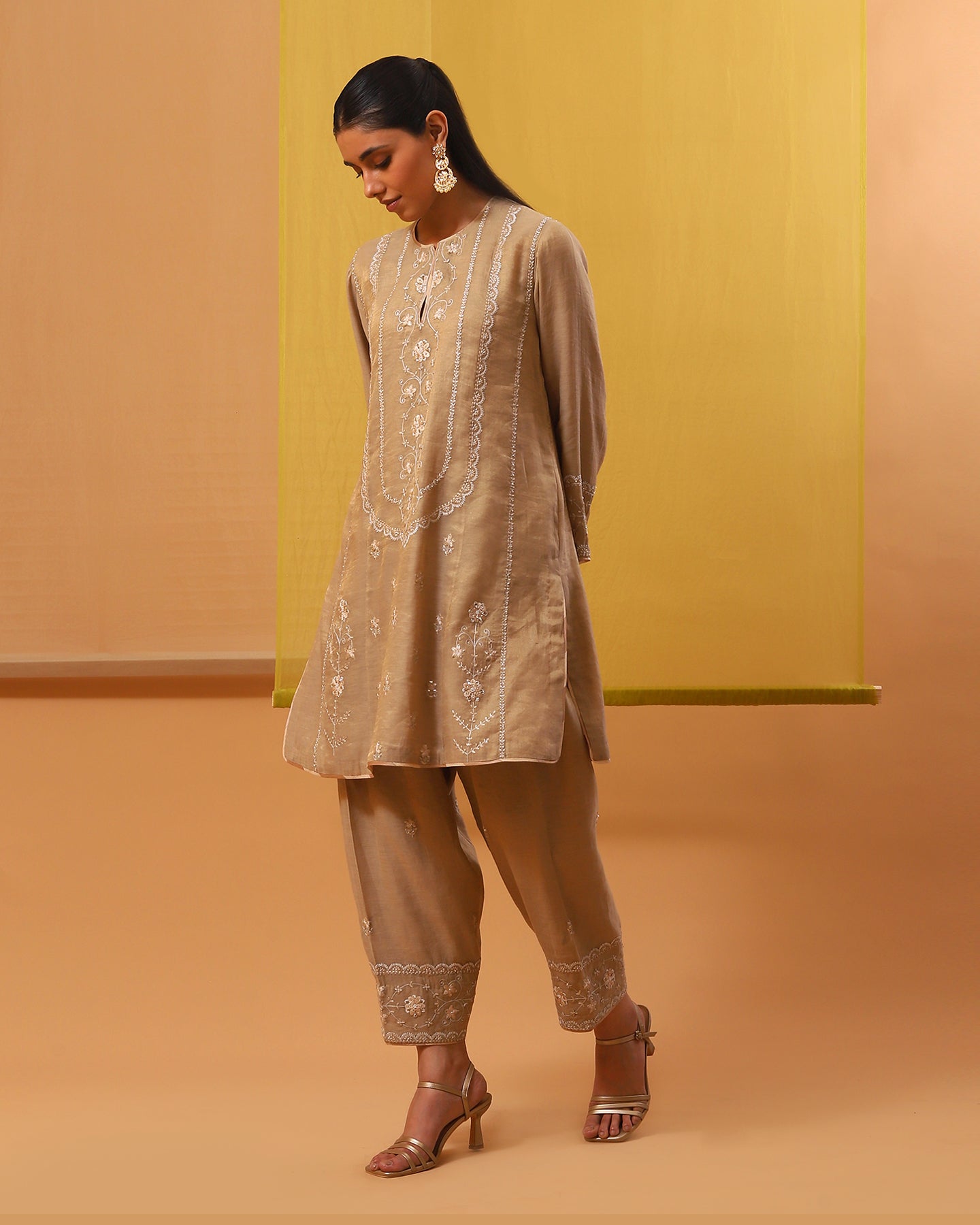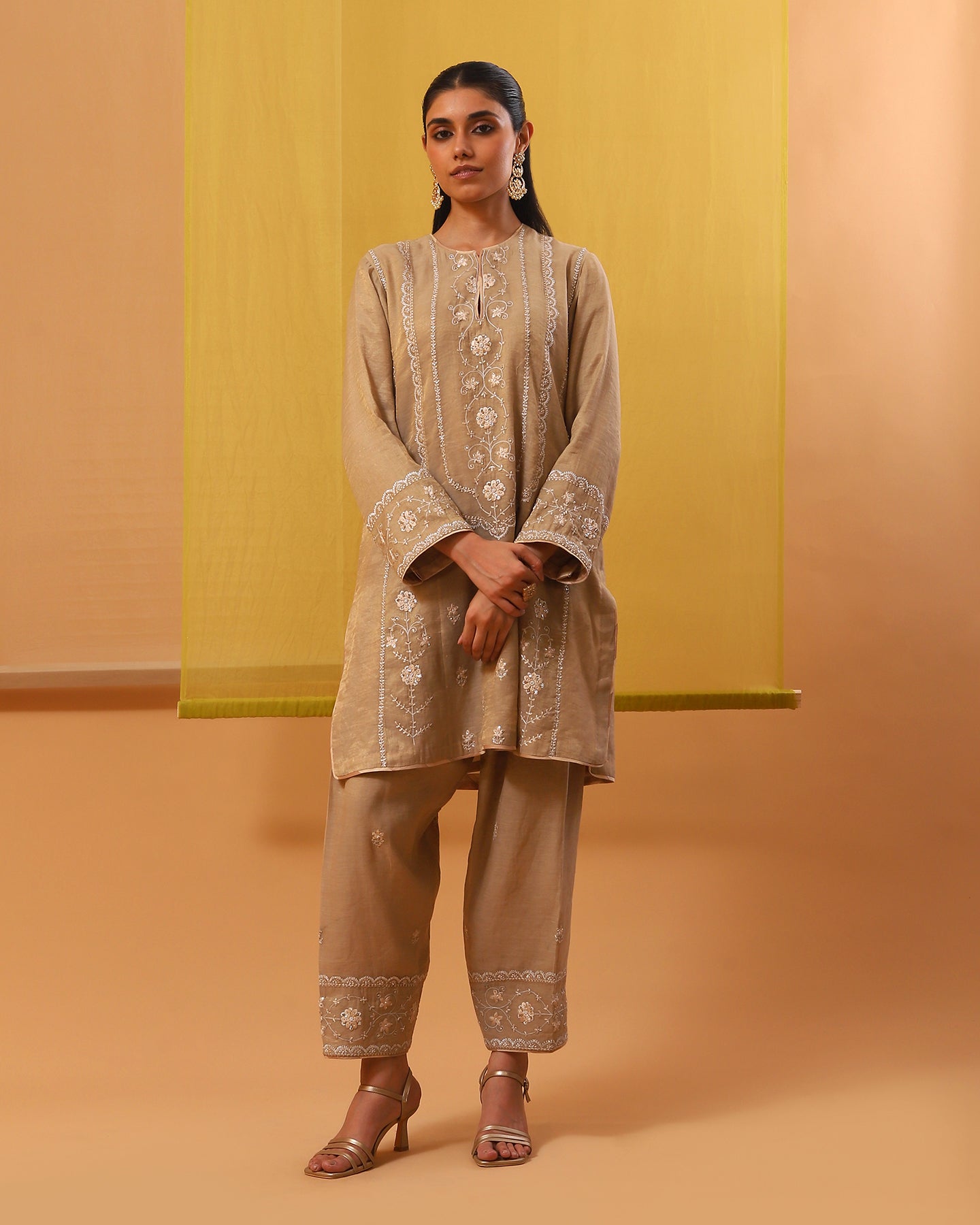 Indulge in the epitome of sophistication with our handwoven cotton tissue short kurta set in soothing beige. Featuring a sophisticated touch neck with a slit and full sleeves. Embroidered delicately with silk threads in tonal hues and embellished with gold sequins and pearls, it exudes timeless elegance. Paired with a matching Pakistani salwar and a pure silk organza dupatta featuring intricate motifs, this ensemble promises to elevate your style with effortless grace and charm.
