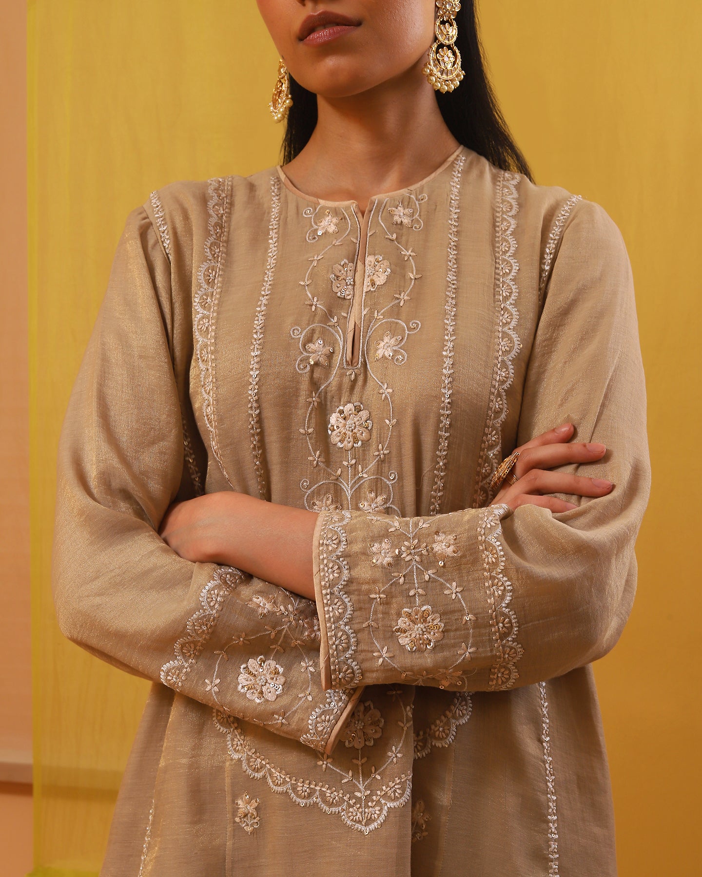 Embroidery Beige silk thread embroidery, highlighted with sequins and pearls.