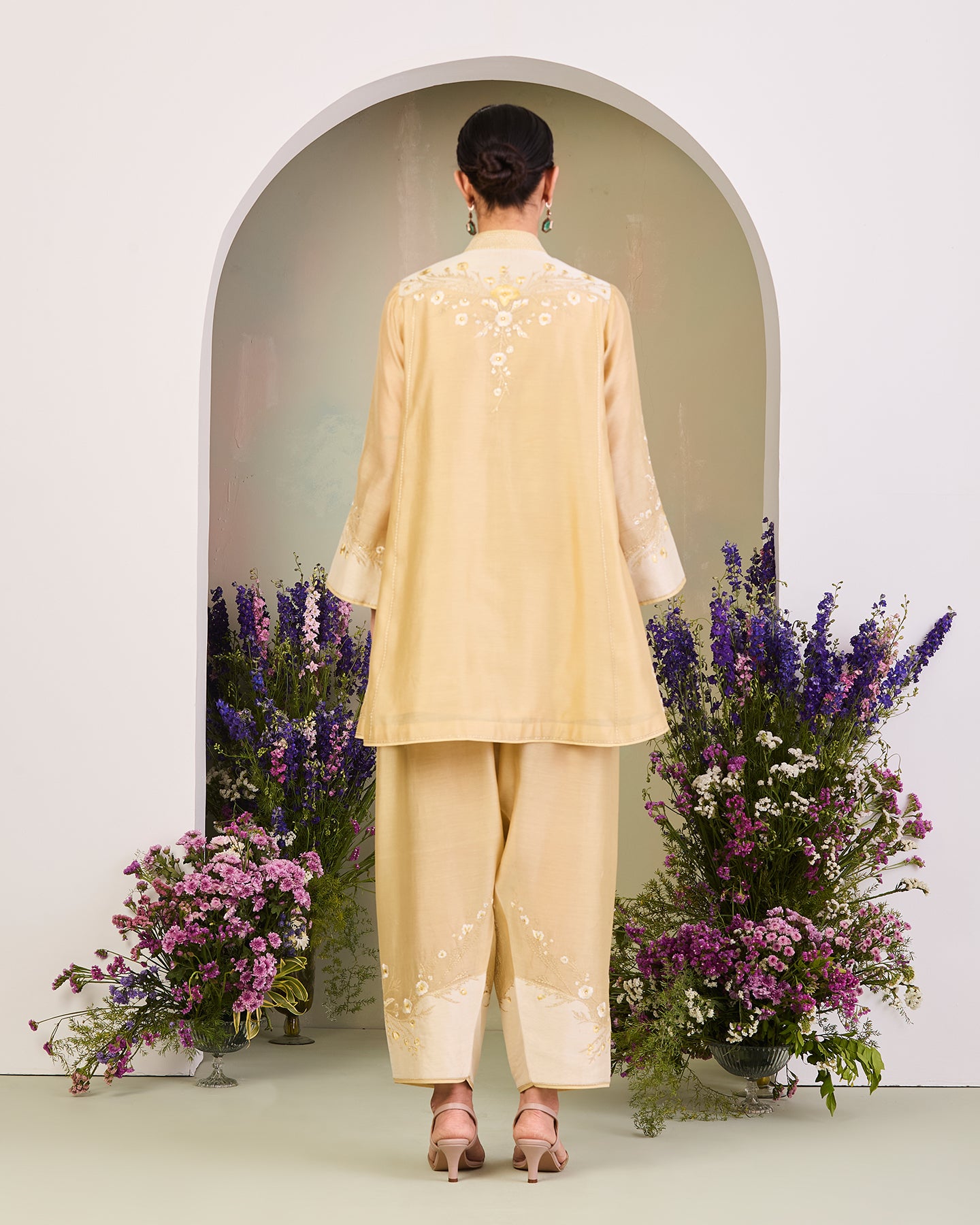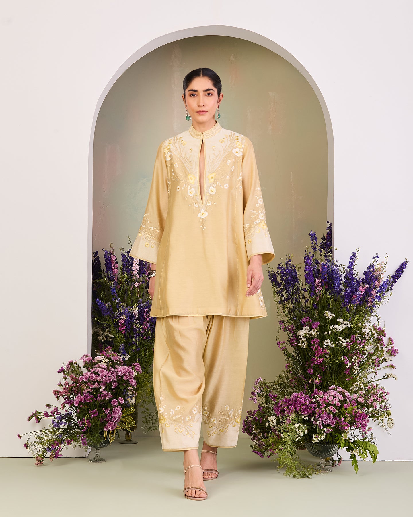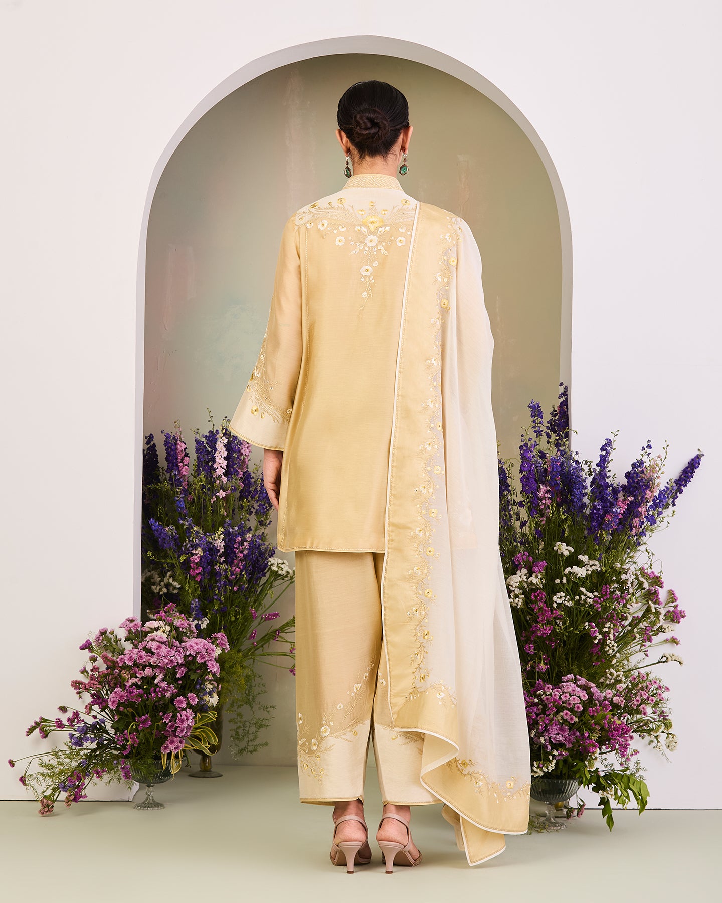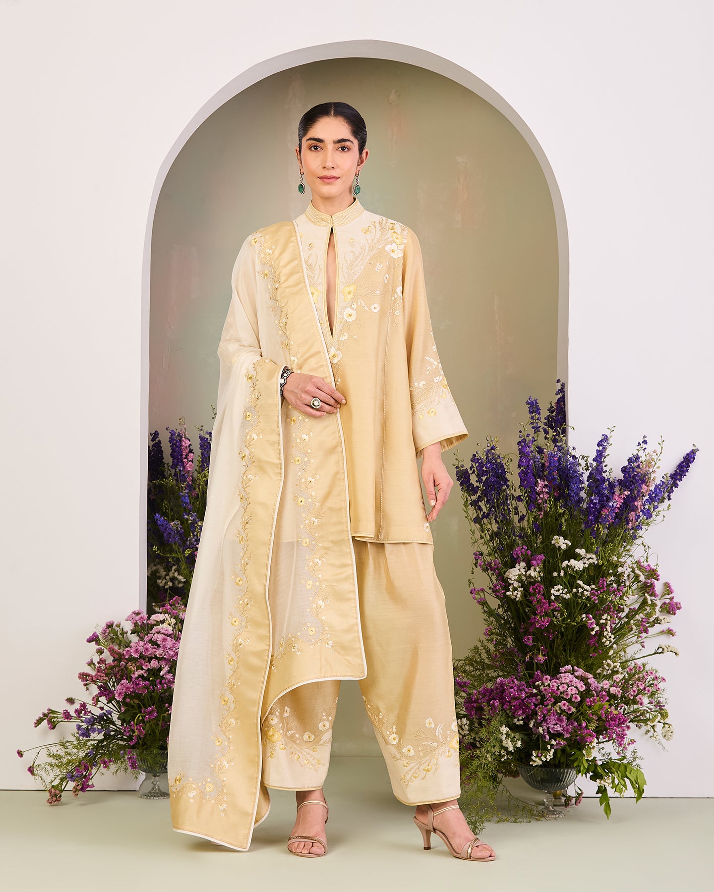 This pastel yellow handwoven silk chanderi A-line short kurta has a mandarin collar with a slit and bell sleeves. It comes with a pair of matching Pakistani salwars and a light yellow handwoven chanderi mulmul dupatta. The set is decorated with appliqué work and multi-colour silk thread flower motifs. Enhanced with Swarovski crystals and a matching piping.