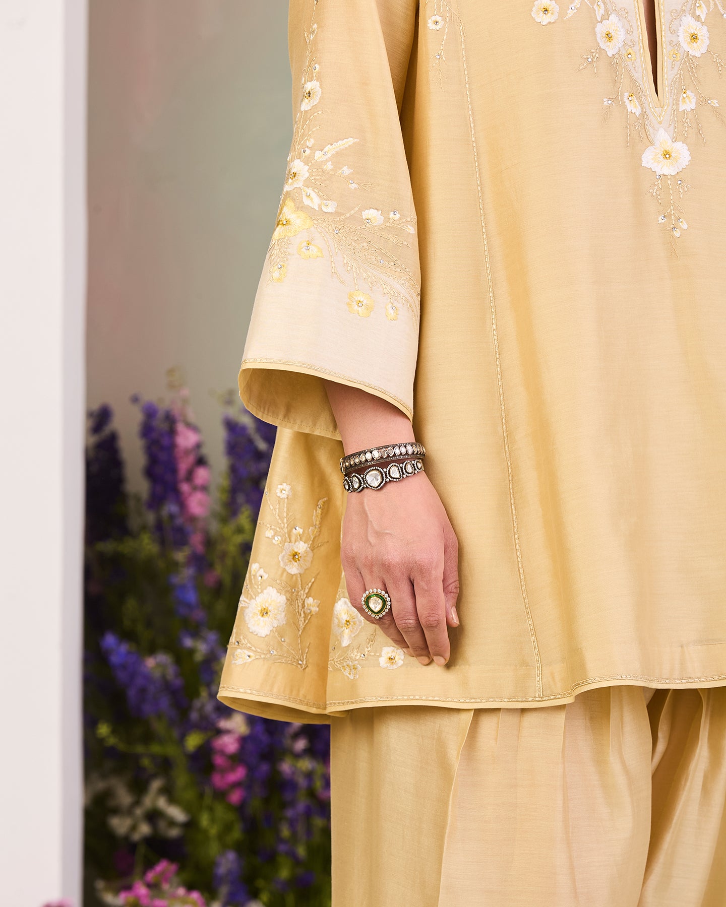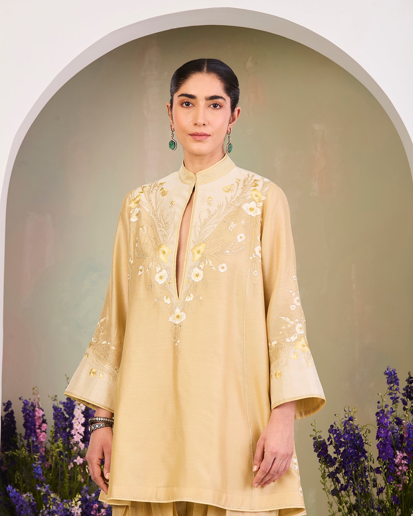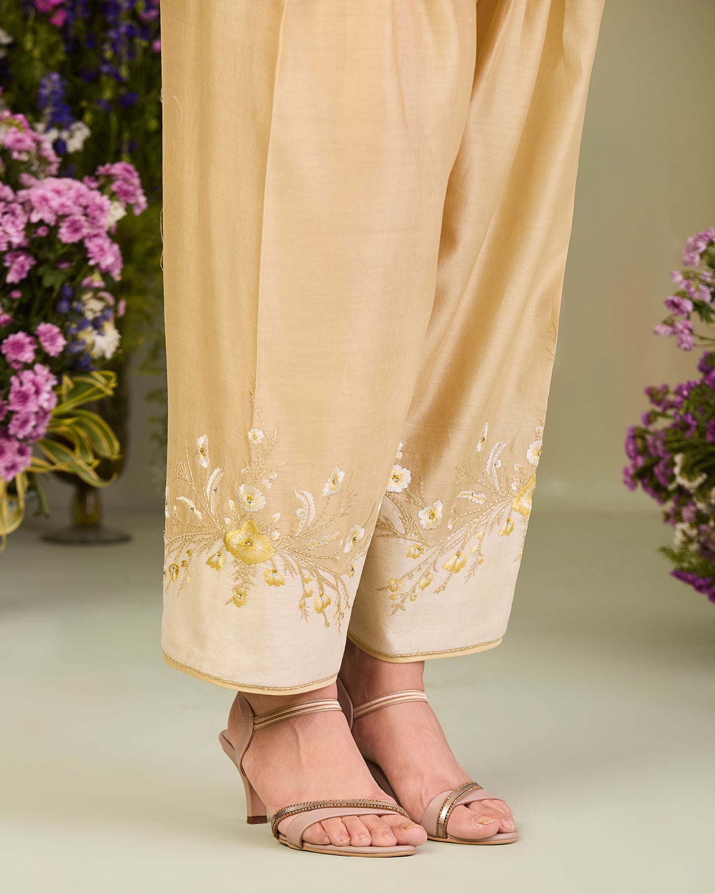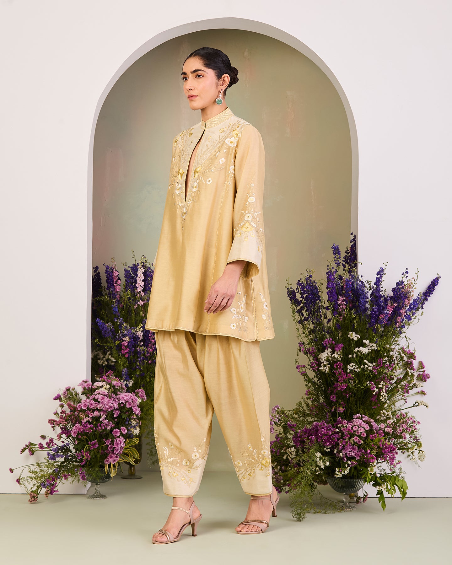 This pastel yellow handwoven silk chanderi A-line short kurta has a mandarin collar with a slit and bell sleeves. It comes with a pair of matching Pakistani salwars and a light yellow handwoven chanderi mulmul dupatta. The set is decorated with appliqué work and multi-colour silk thread flower motifs. Enhanced with Swarovski crystals and a matching piping.