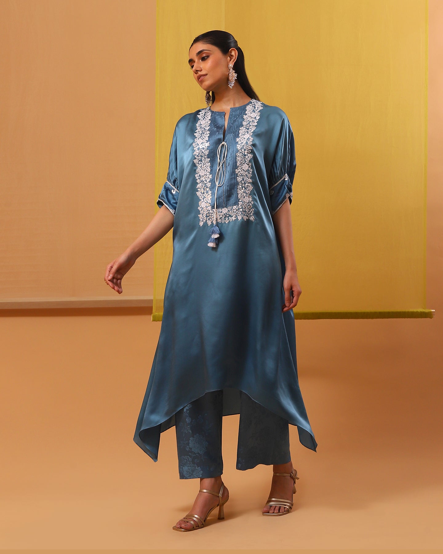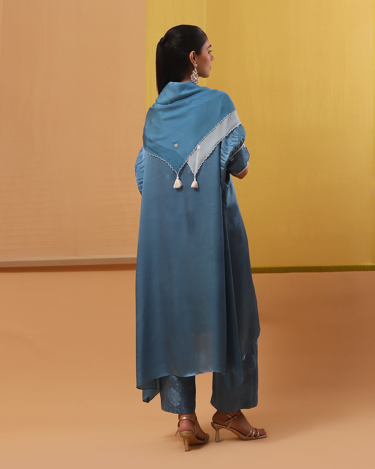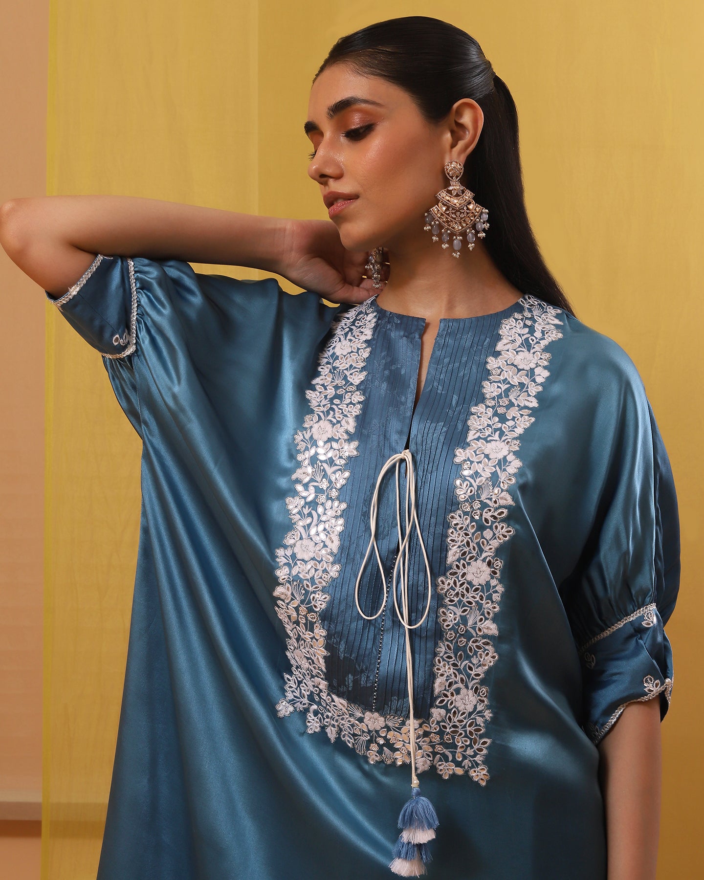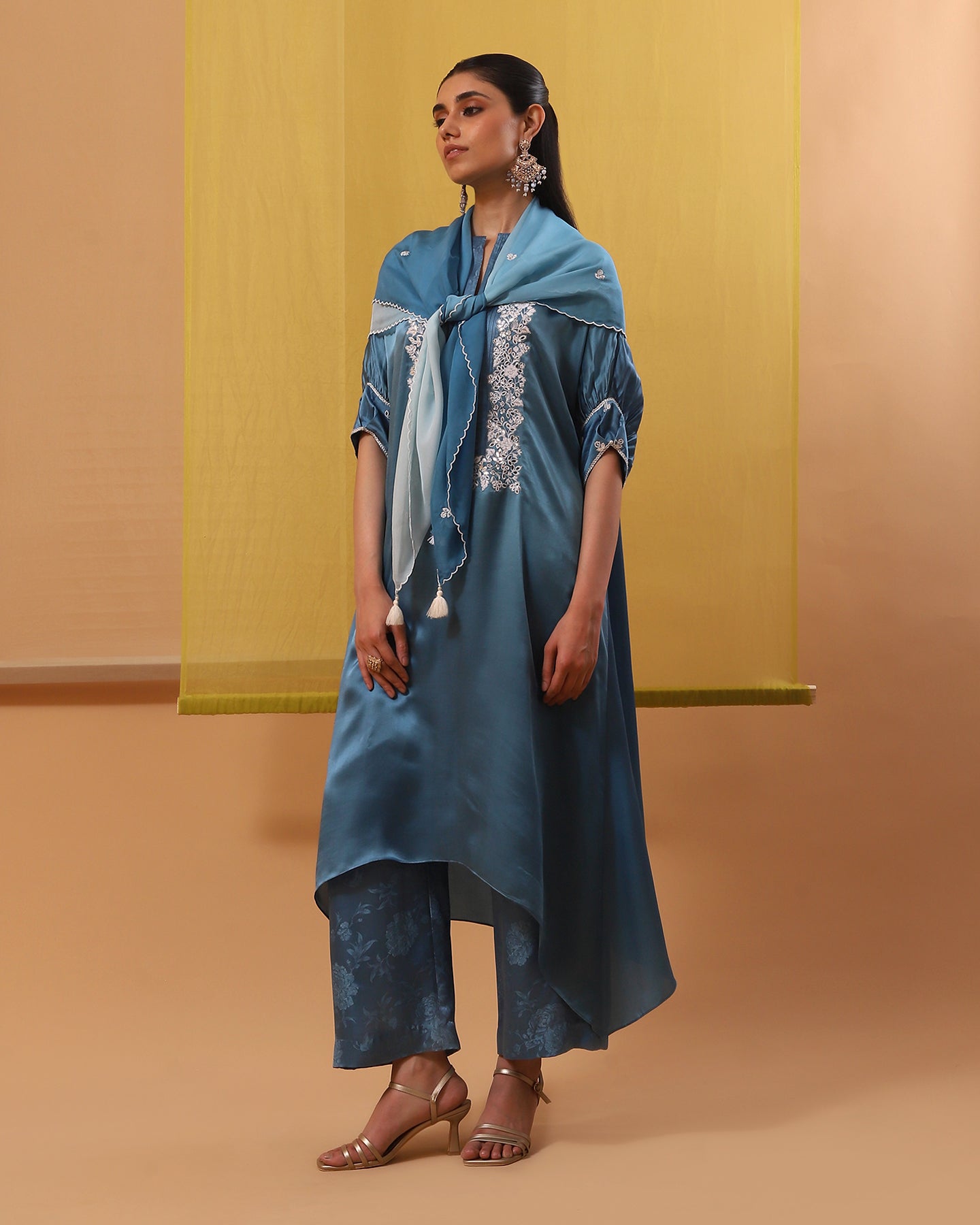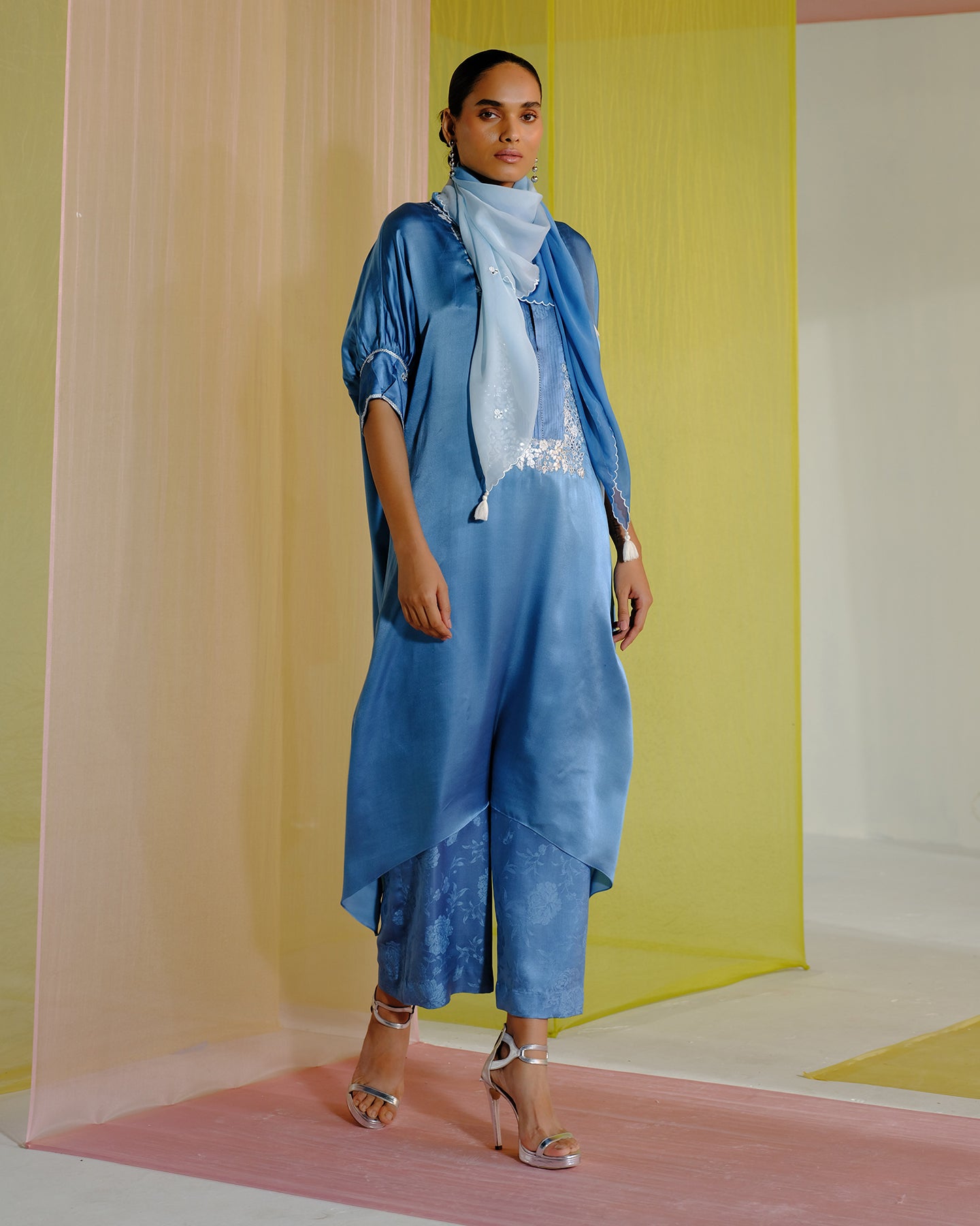 Make a statement with this stunning pure silk satin kaftan set in a brilliant blue colour. The kaftan's traditional touch neckline with a slit, gathered sleeves with cuffs, and pure satin jacquard pin-tucks yoke exude timeless beauty. Intricate patri work in off-white cotton thread adorns the attire, creating intricate floral designs that are delicately enhanced with hand-done silver sequins and zari for an enchanting touch. Paired with matching pure satin jacquard straight pants, this ensemble emanates effortless sophistication. An ombre dyed pure flat chiffon scarf, featuring delicate floral motifs, scalloped hemline and tassels completes the look and adds the final touch of elegance.