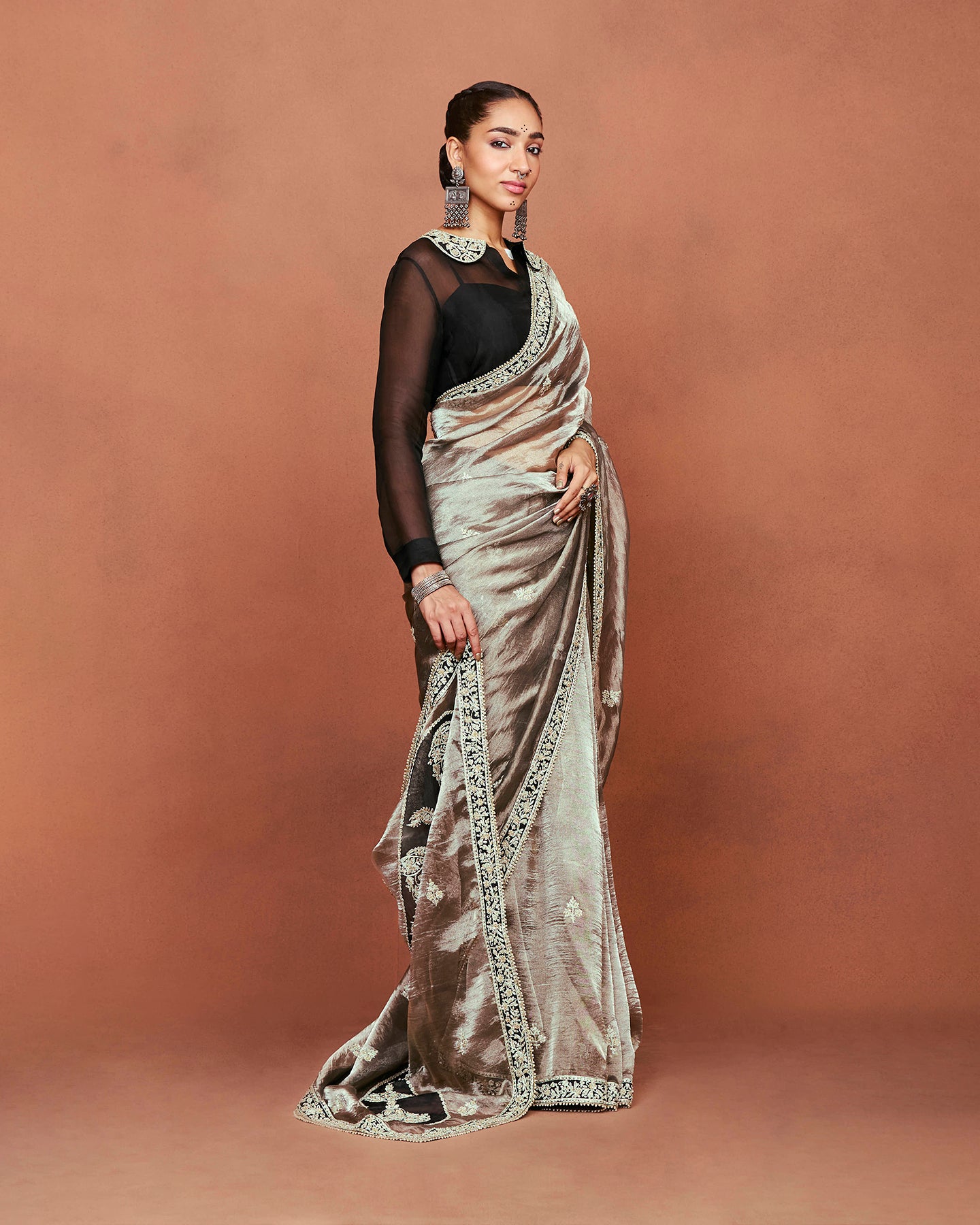 This grey handwoven tissue silk saree has been paired with a black pure silk organza crop top blouse and a pure silk bustier. The blouse features a peter pan collar, buttoned front placket, and full-length sleeves with cuffs. The set showcases appliquéd paisley motifs and intricate floral motifs embroidered using dori, sequins, and beads.