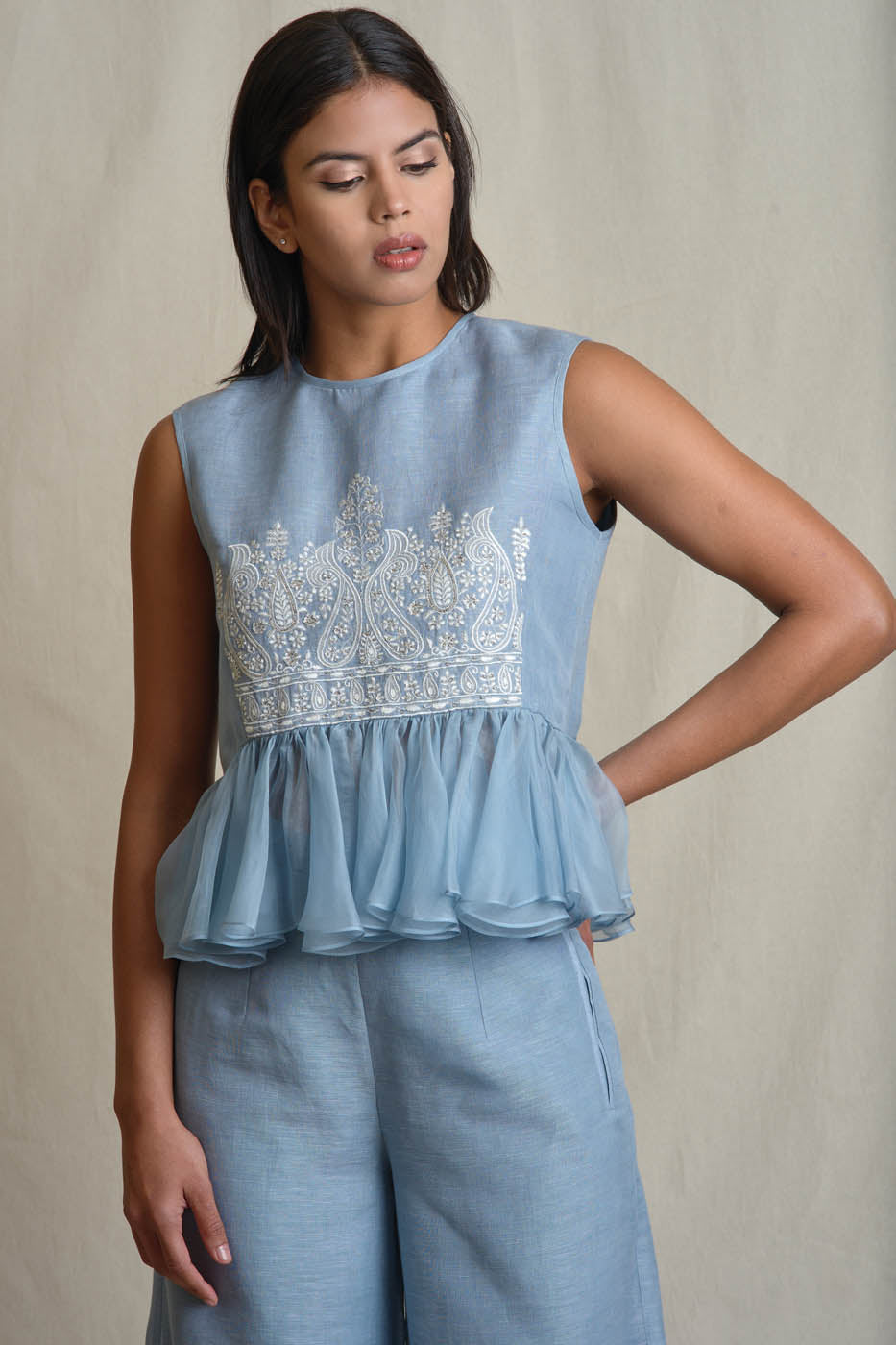 Powder blue linen crop top with with resham and silver aari work paired with linen pants.