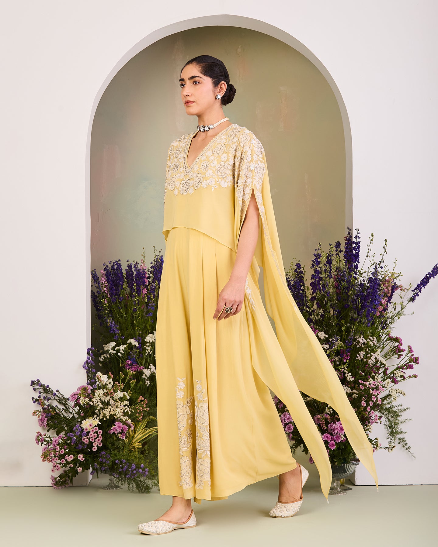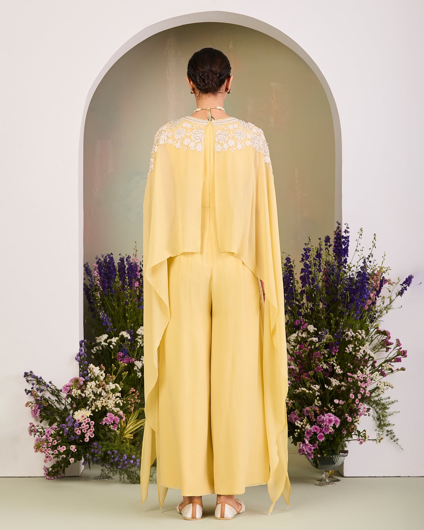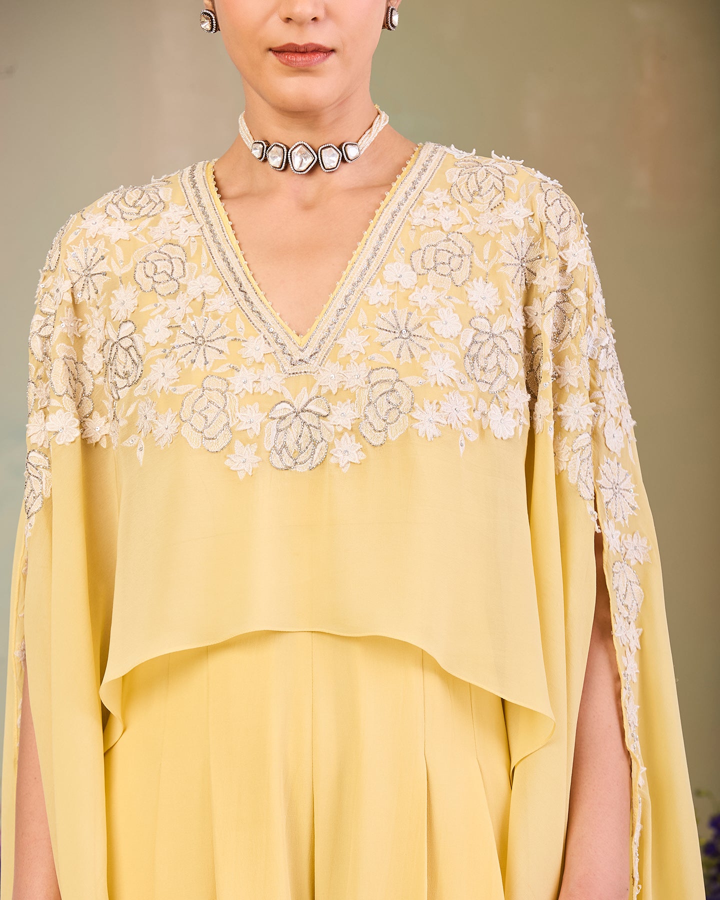 This pastel yellow cape style pure georgette jumpsuit features a V-neck and asymmetrical sleeves. It is adorned with 3D vintage flowers and eloquent rose motifs crafted using silk threads, sequins, beads, and Swarovski crystals.