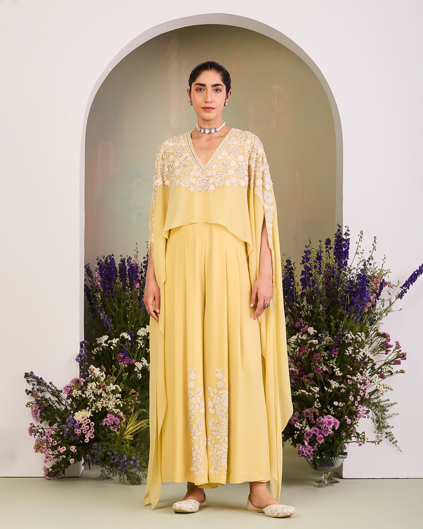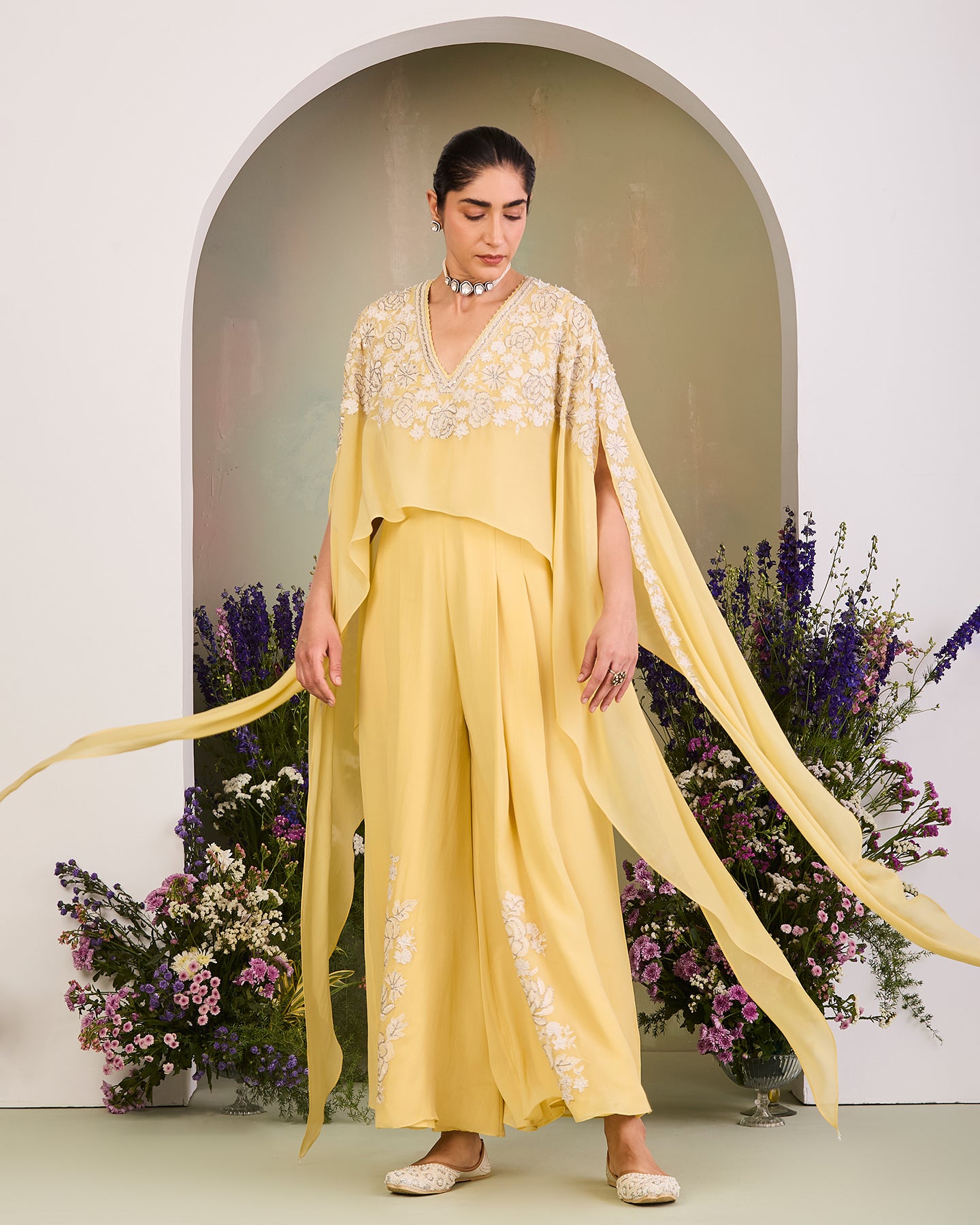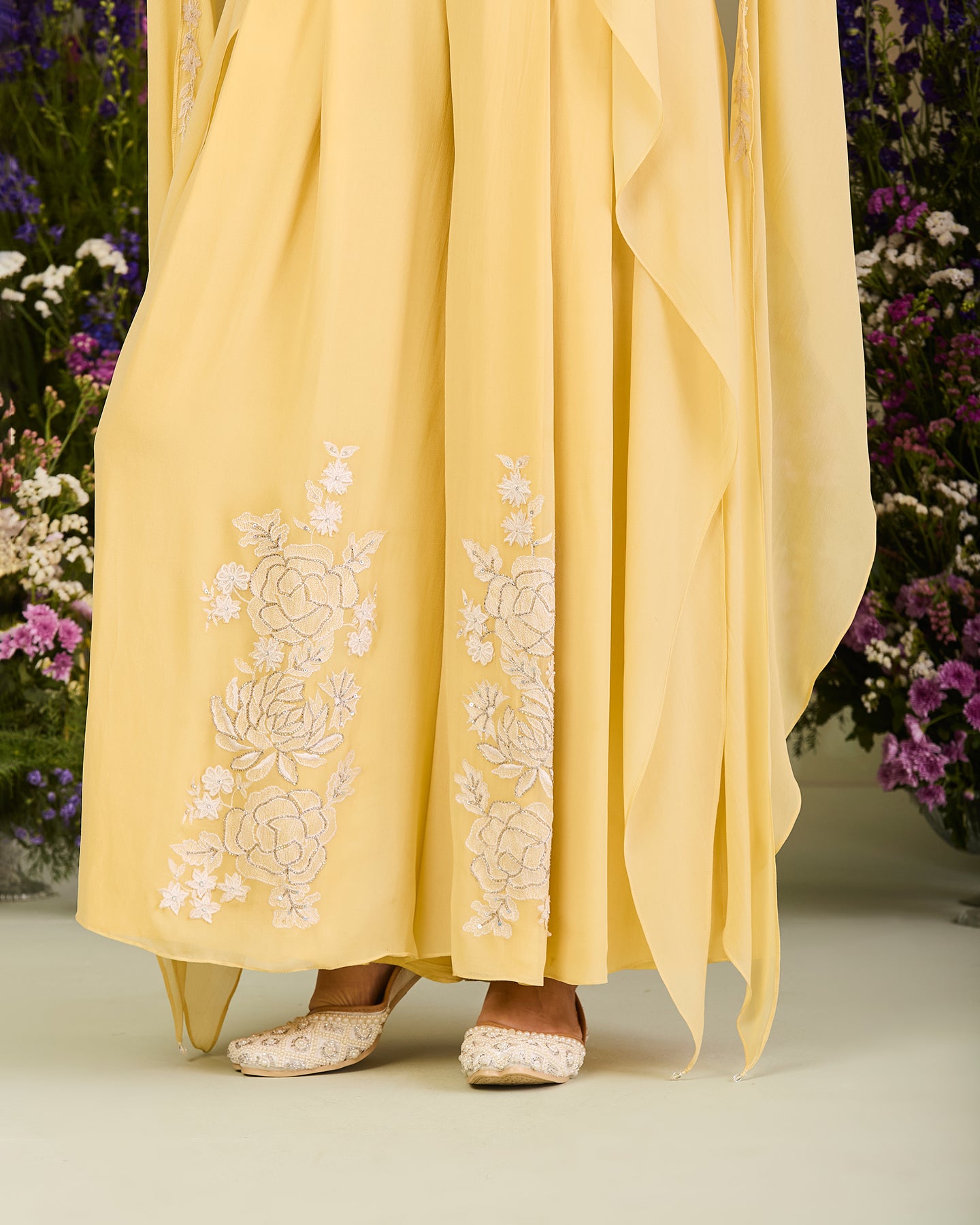 This pastel yellow cape style pure georgette jumpsuit features a V-neck and asymmetrical sleeves. It is adorned with 3D vintage flowers and eloquent rose motifs crafted using silk threads, sequins, beads, and Swarovski crystals.