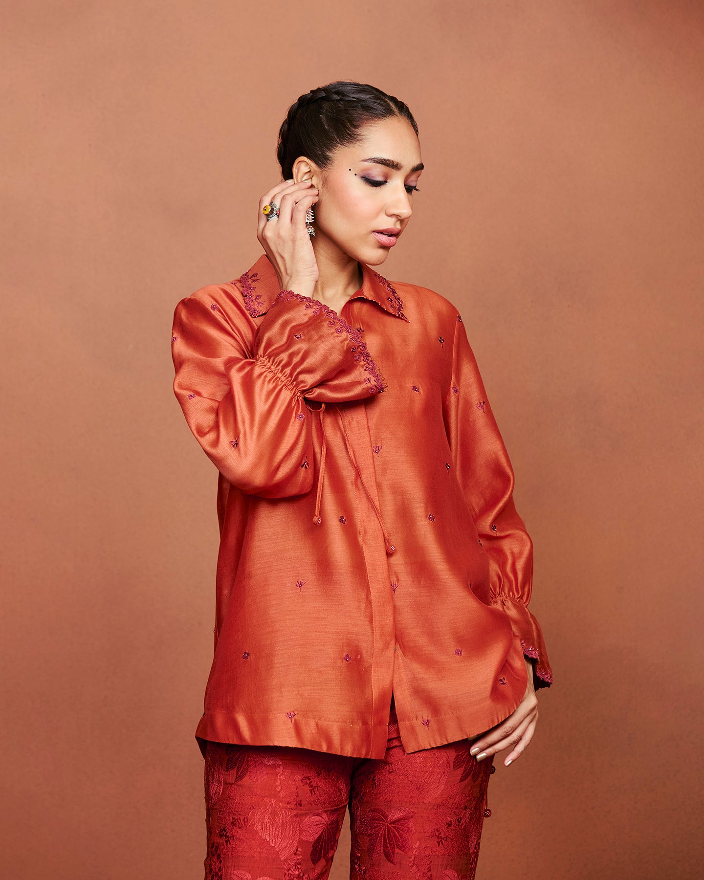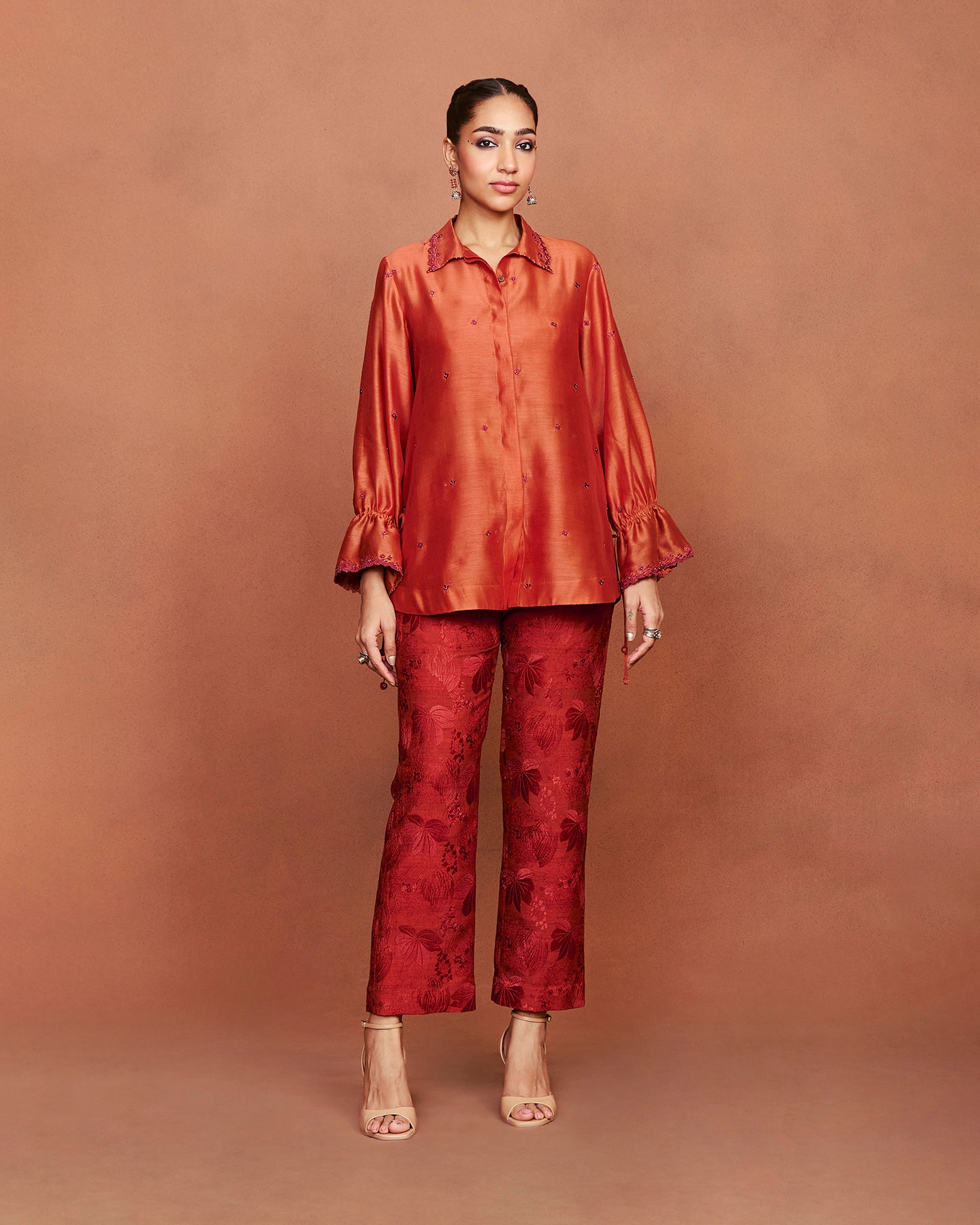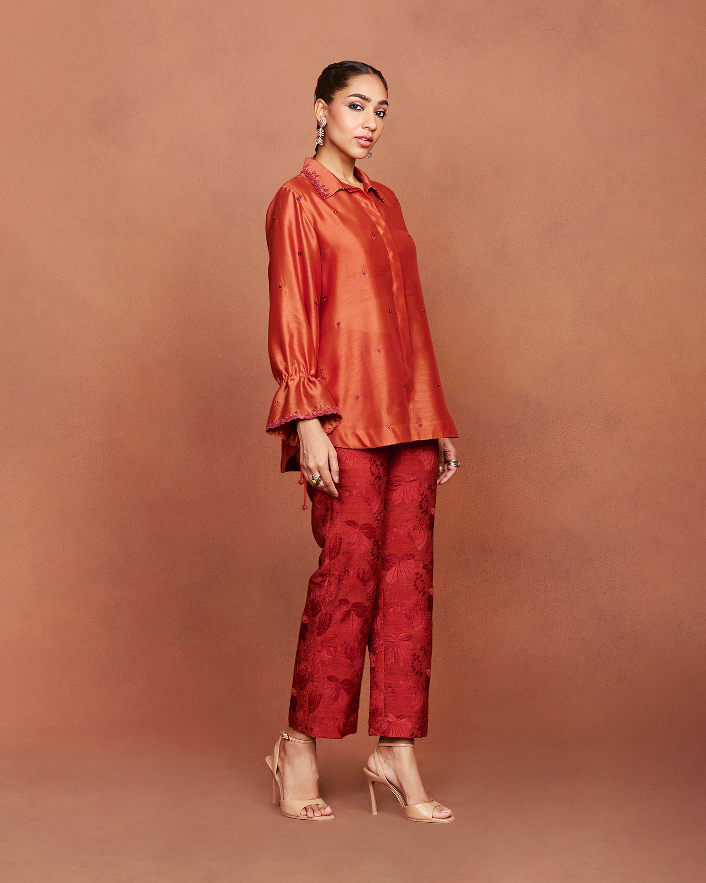This is a rusty orange handwoven silk chanderi co-ordinate set. The shirt has a classic shirt collar, front placket and ruffle-cuff sleeves with tassel tie-ups. Paired with raw silk straight fit pants featuring functional side pockets. The set is adorned with floral motifs using silk threads, beads, and cut work. Option of an under slip or a bustier is available to complete the look.